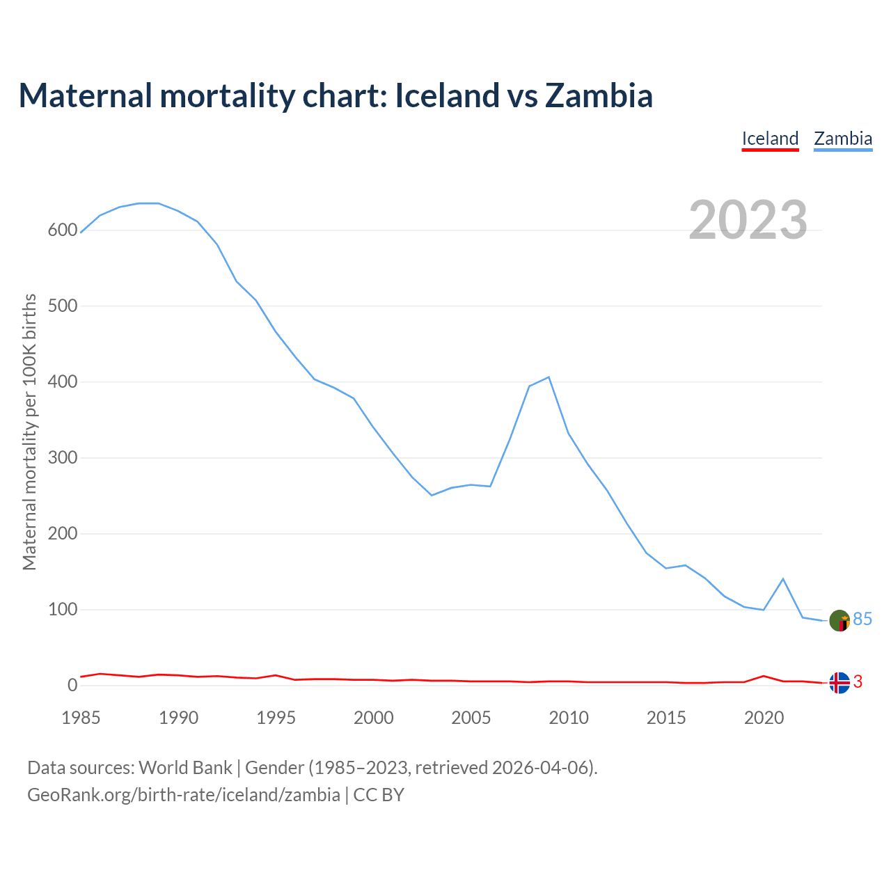 The maternal mortality rate, which is the probability of dying during childbirth or within 42 days of pregnancy termination, is 3 deaths per 100,000 live births in Iceland, compared to 85 deaths in Zambia.