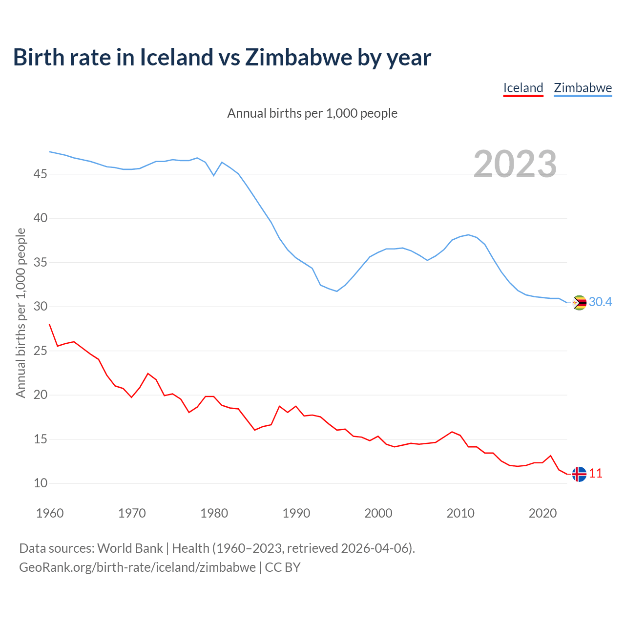 Iceland has an annual birth rate of 11 births per 1,000 people, compared to 30.4 for Zimbabwe. The average number of children a woman is expected to have during her lifetime — the fertility rate, is 1.59 in Iceland and 3.72 in Zimbabwe — 134.2% difference.
