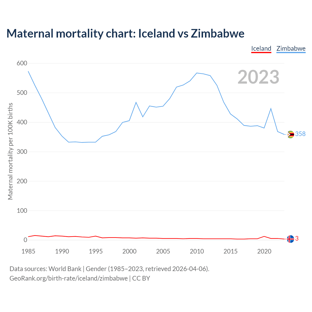 The maternal mortality rate, which is the probability of dying during childbirth or within 42 days of pregnancy termination, is 3 deaths per 100,000 live births in Iceland, compared to 358 deaths in Zimbabwe.
