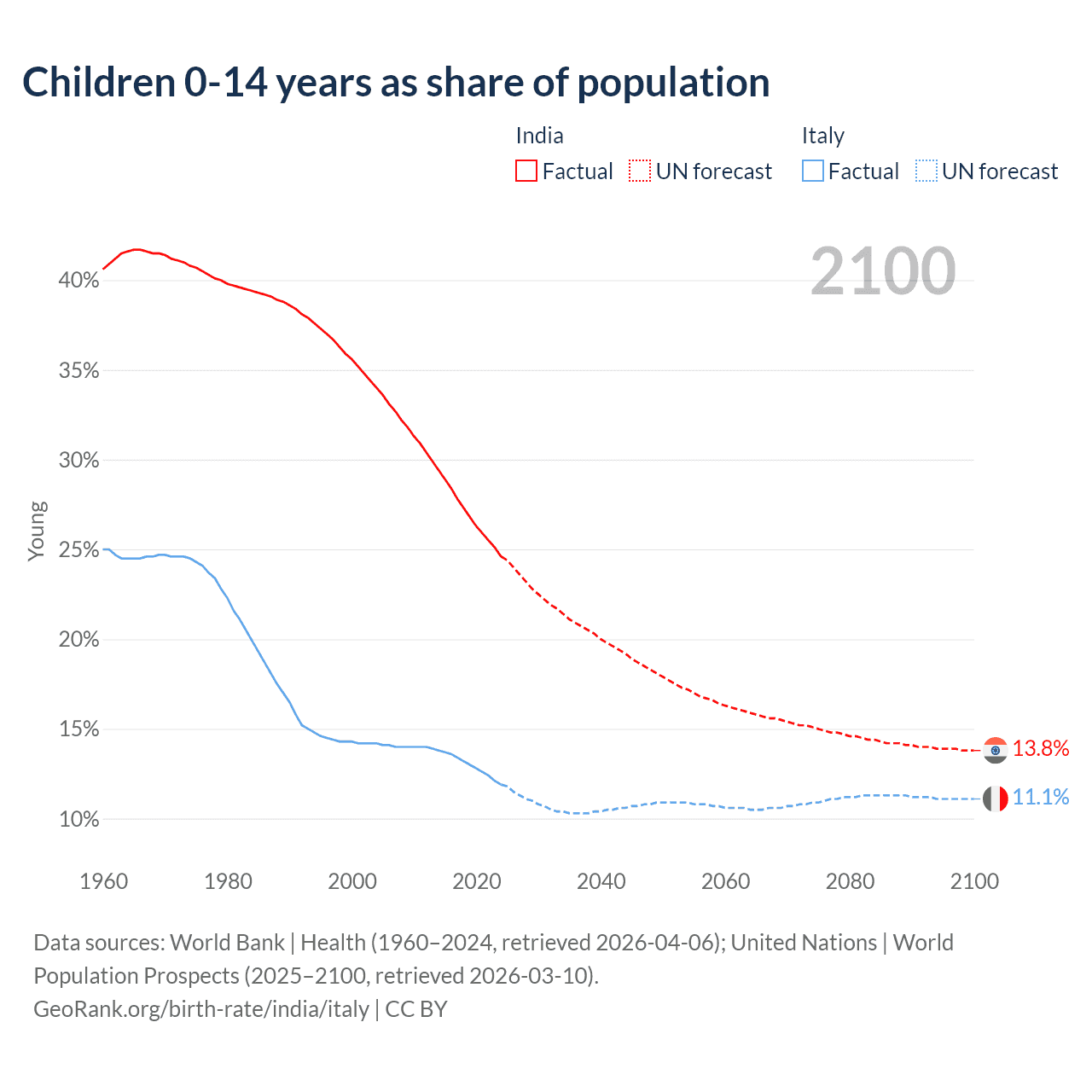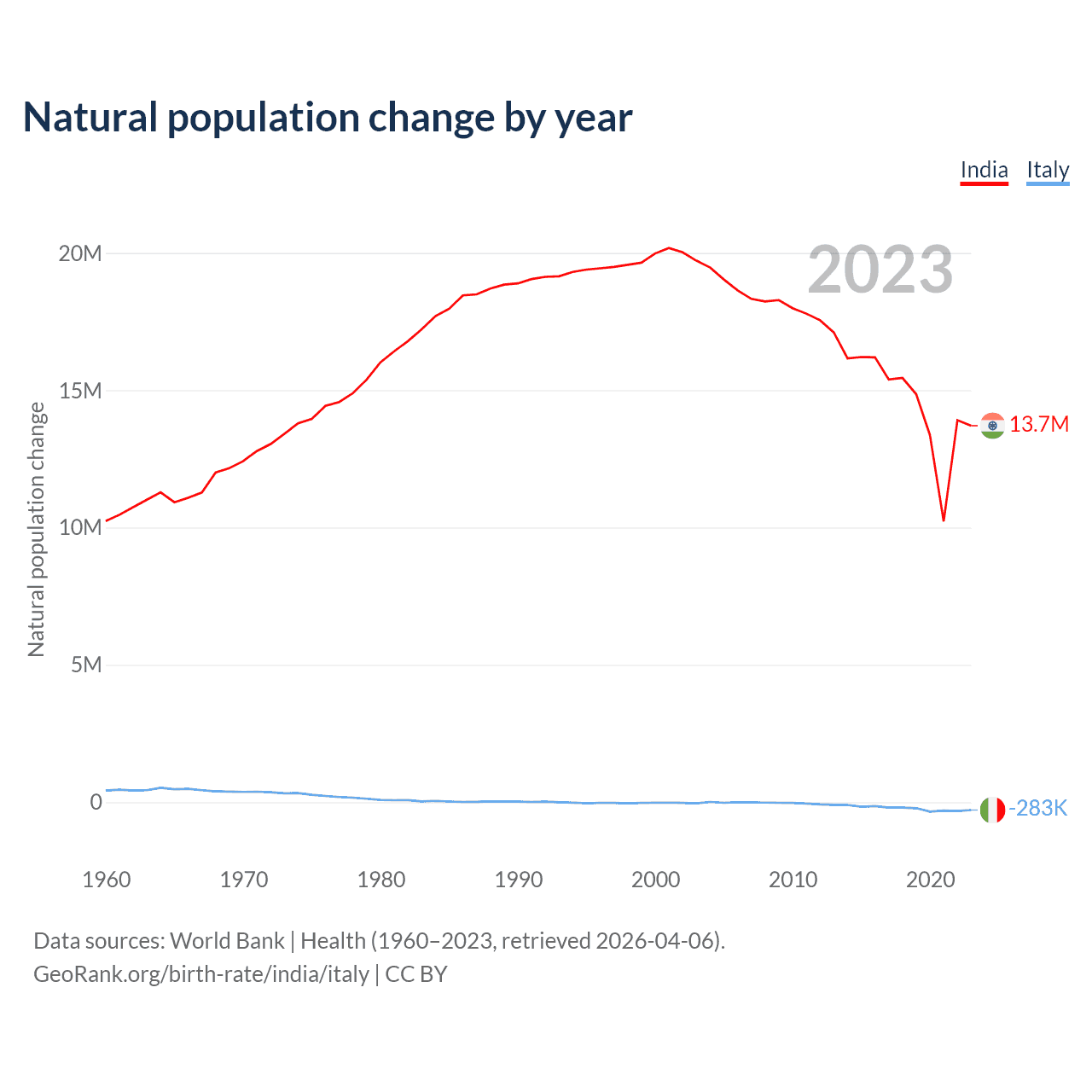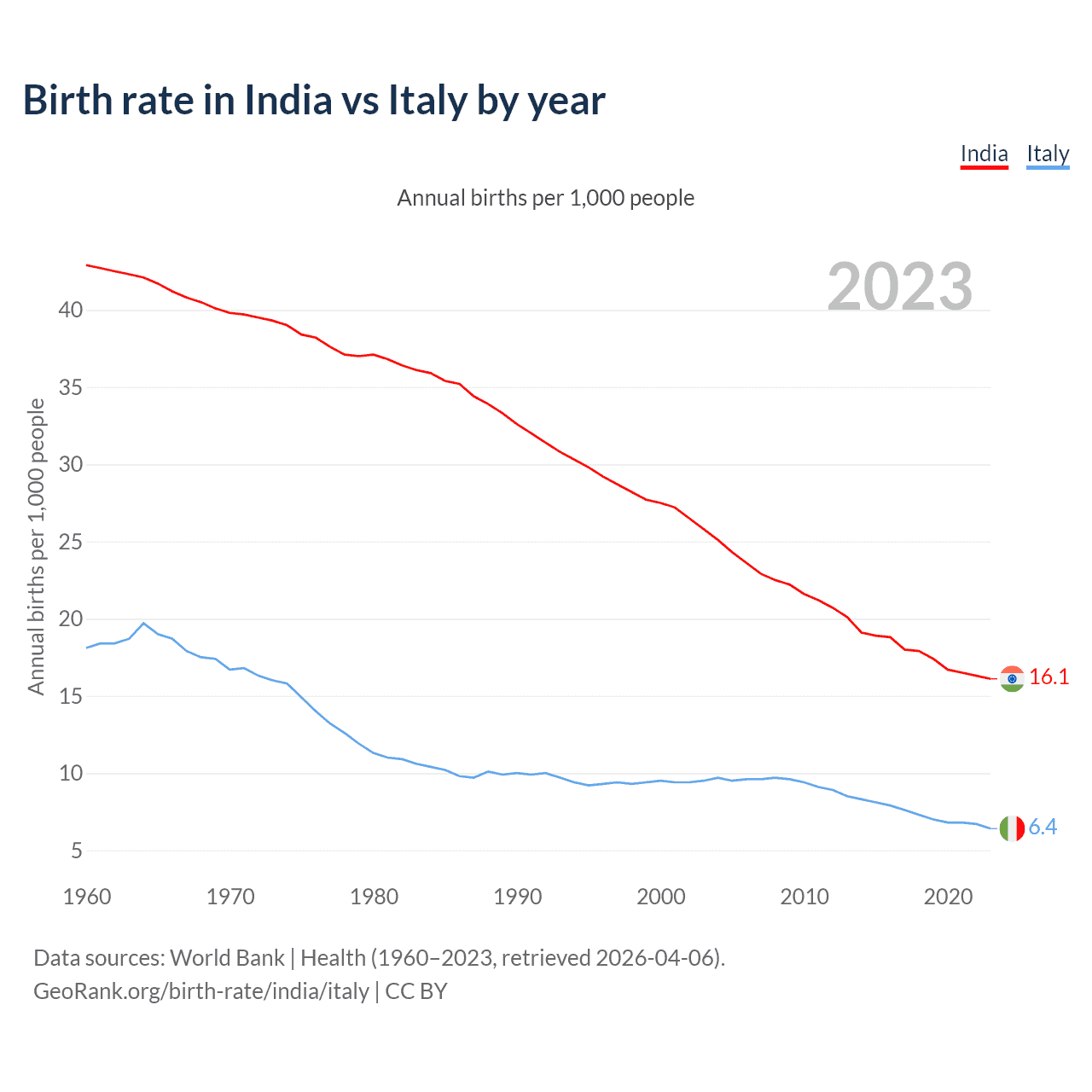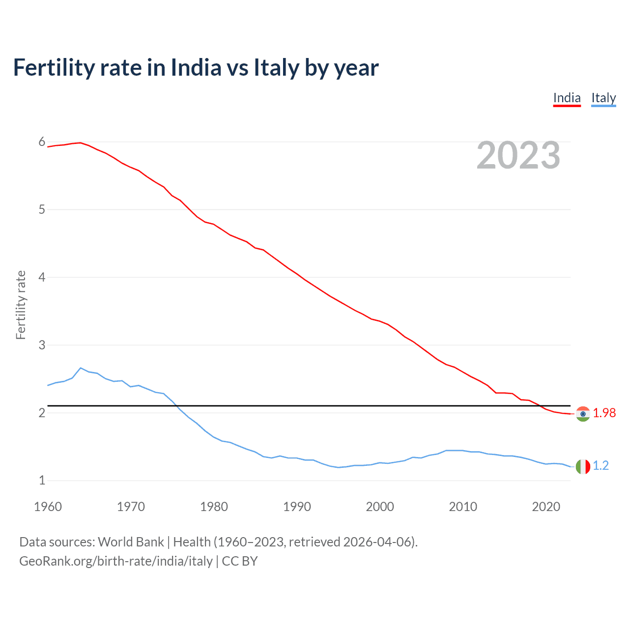 According to the latest available data on birth rates, the fertility rate in India was 1.98 children per woman in 2023, compared to 1.2 in Italy in 2023. The replacement level is considered to be 2.1 children per woman.