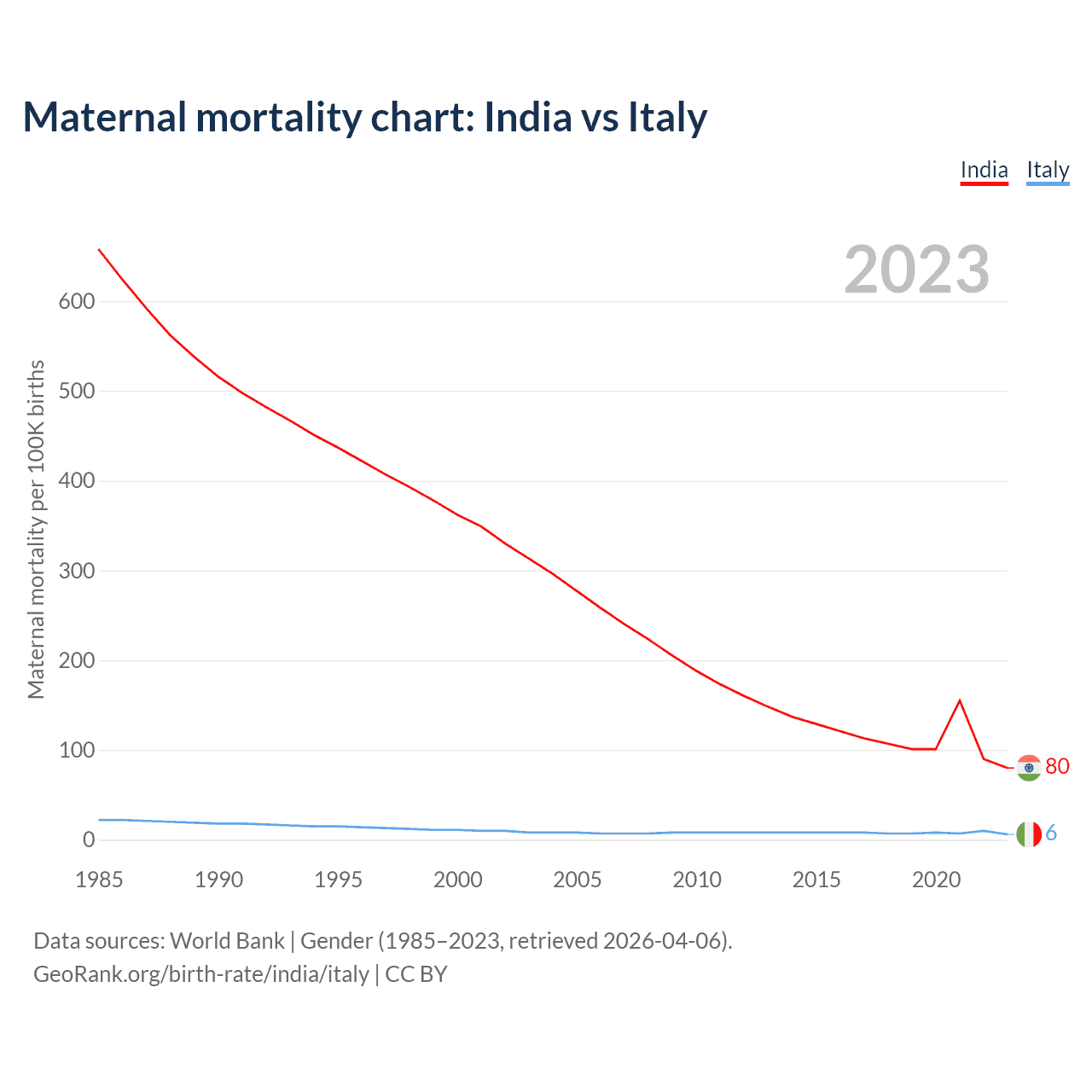 The maternal mortality rate, which is the probability of dying during childbirth or within 42 days of pregnancy termination, is 80 deaths per 100,000 live births in India, compared to 6 deaths in Italy.