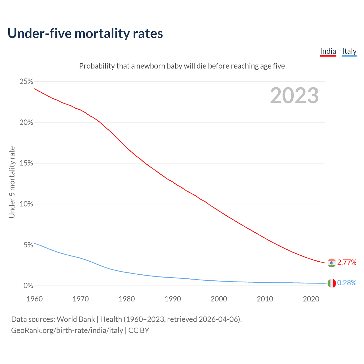 The chance that a newborn baby will die before reaching age five is 2.77% in India and 0.28% in Italy. Above is a chart with historical data on under-five mortality rates.