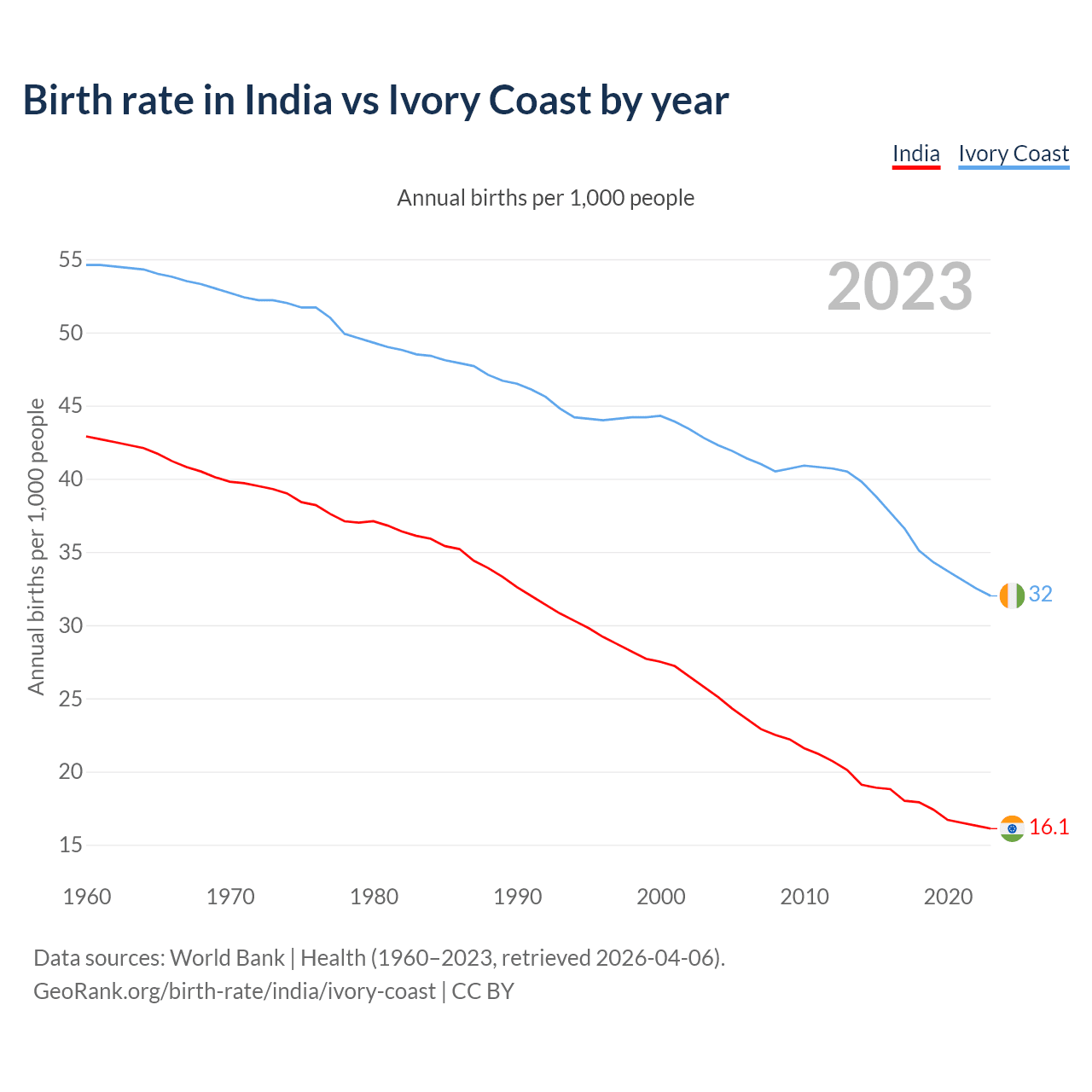 India has an annual birth rate of 16.1 births per 1,000 people, compared to 32 for Ivory Coast. The average number of children a woman is expected to have during her lifetime — the fertility rate, is 1.98 in India and 4.28 in Ivory Coast — 116.9% difference.
