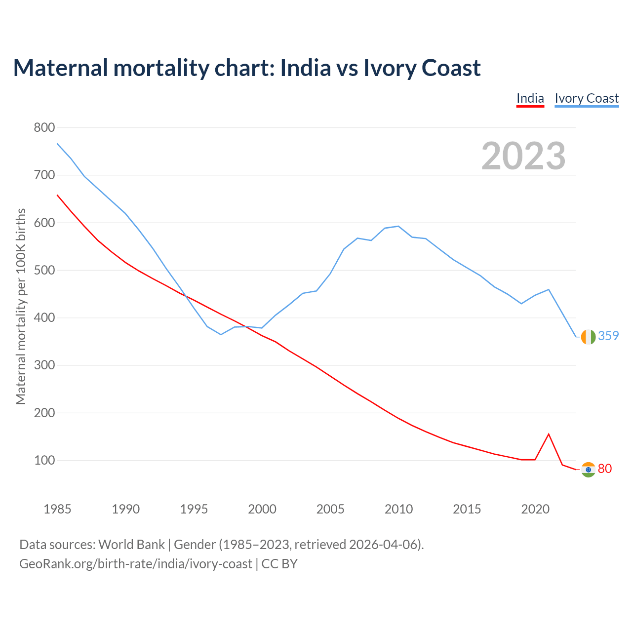 The maternal mortality rate, which is the probability of dying during childbirth or within 42 days of pregnancy termination, is 80 deaths per 100,000 live births in India, compared to 359 deaths in Ivory Coast.