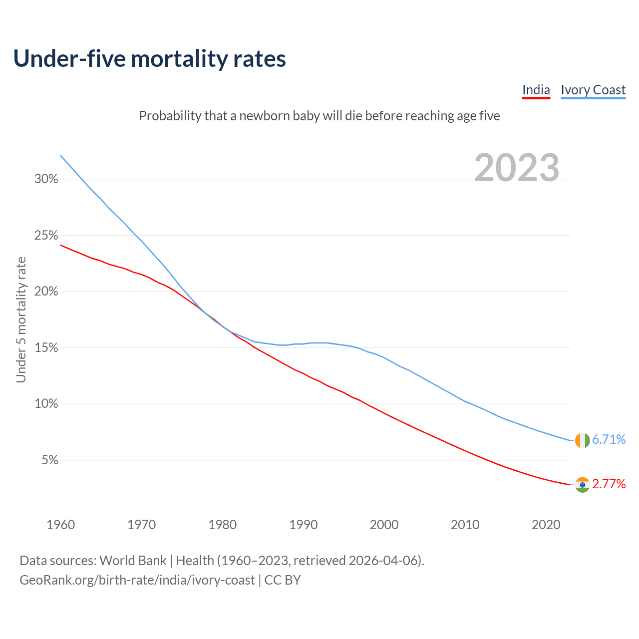 The chance that a newborn baby will die before reaching age five is 2.77% in India and 6.71% in Ivory Coast. Above is a chart with historical data on under-five mortality rates.