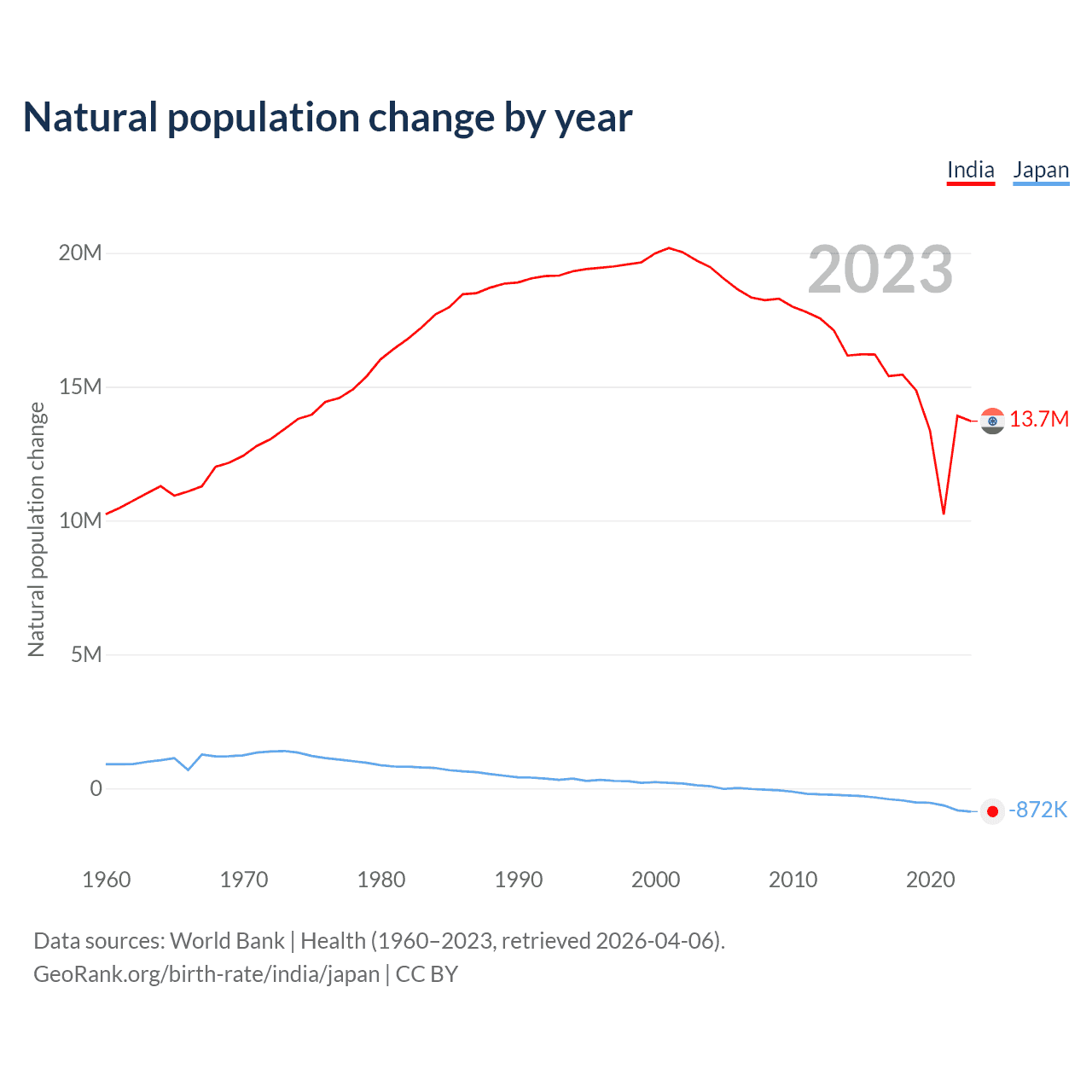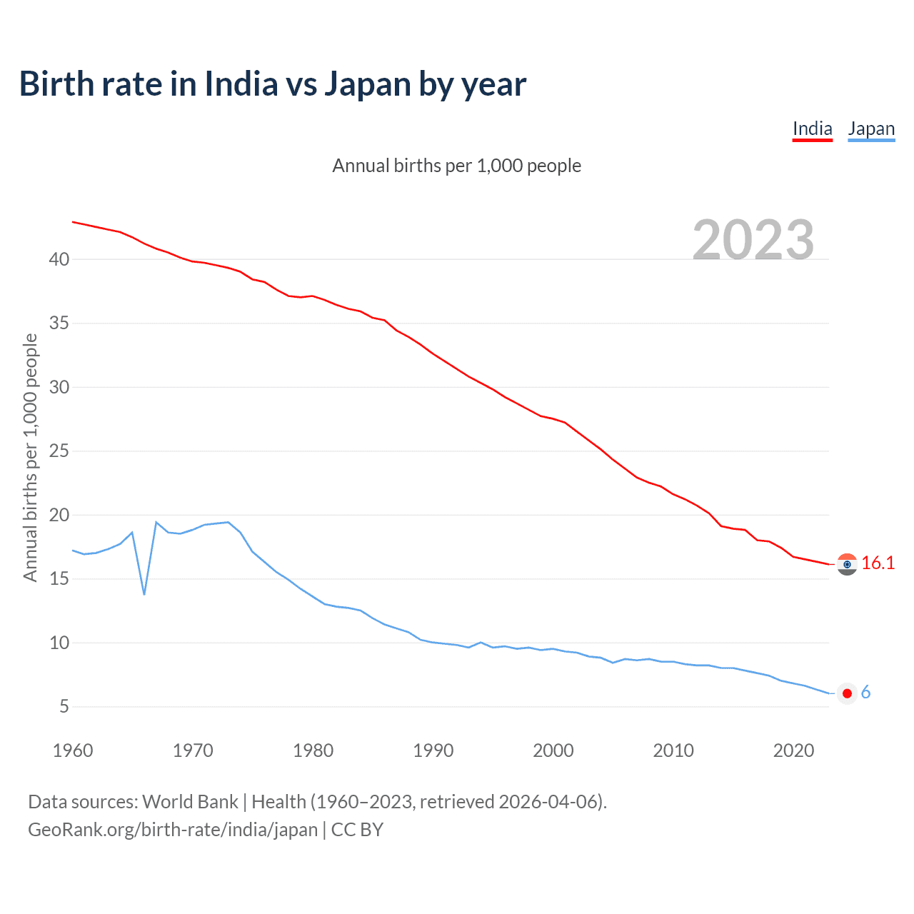 India has an annual birth rate of 16.1 births per 1,000 people, compared to 6 for Japan. The average number of children a woman is expected to have during her lifetime — the fertility rate, is 1.98 in India and 1.2 in Japan — 39.2% difference.