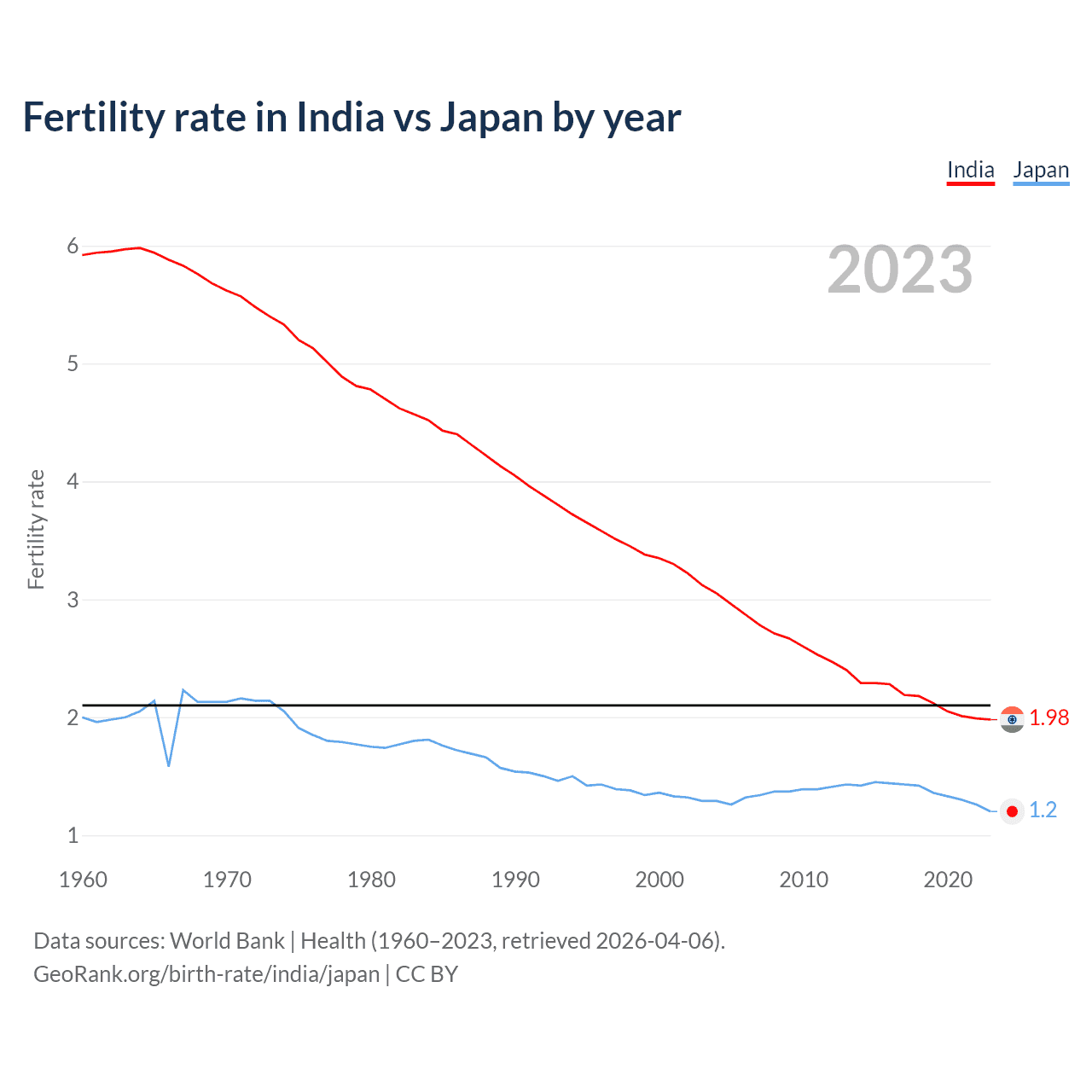 According to the latest available data on birth rates, the fertility rate in India was 1.98 children per woman in 2023, compared to 1.2 in Japan in 2023. The replacement level is considered to be 2.1 children per woman.