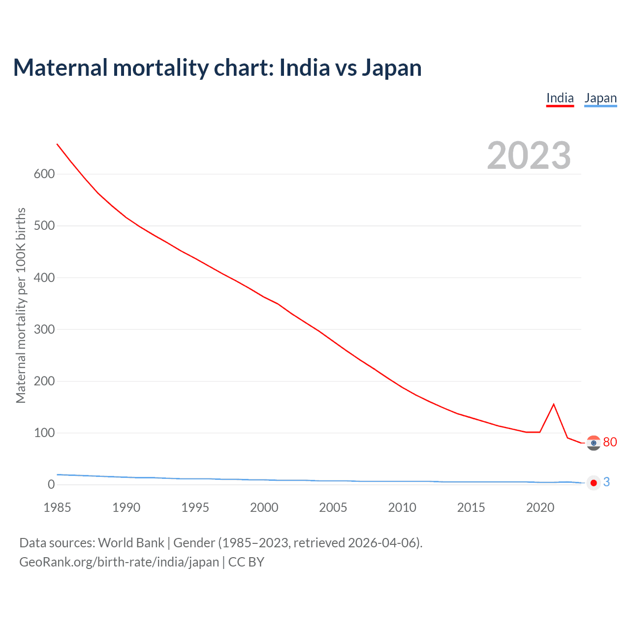 The maternal mortality rate, which is the probability of dying during childbirth or within 42 days of pregnancy termination, is 80 deaths per 100,000 live births in India, compared to 3 deaths in Japan.