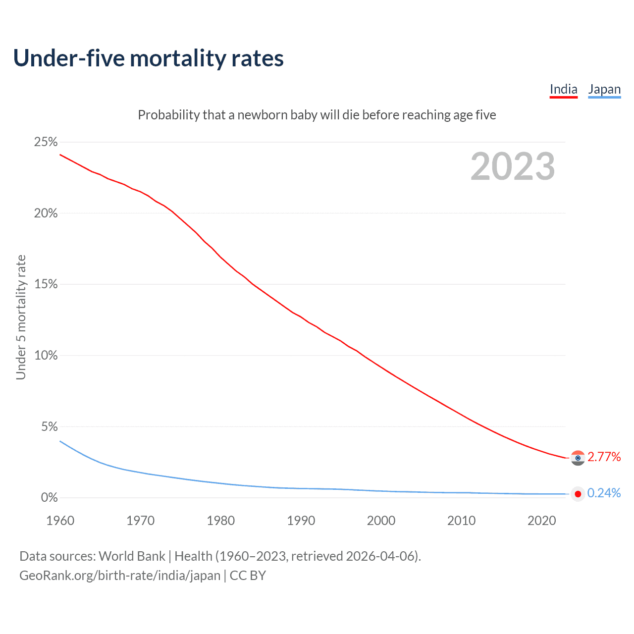The chance that a newborn baby will die before reaching age five is 2.77% in India and 0.24% in Japan. Above is a chart with historical data on under-five mortality rates.