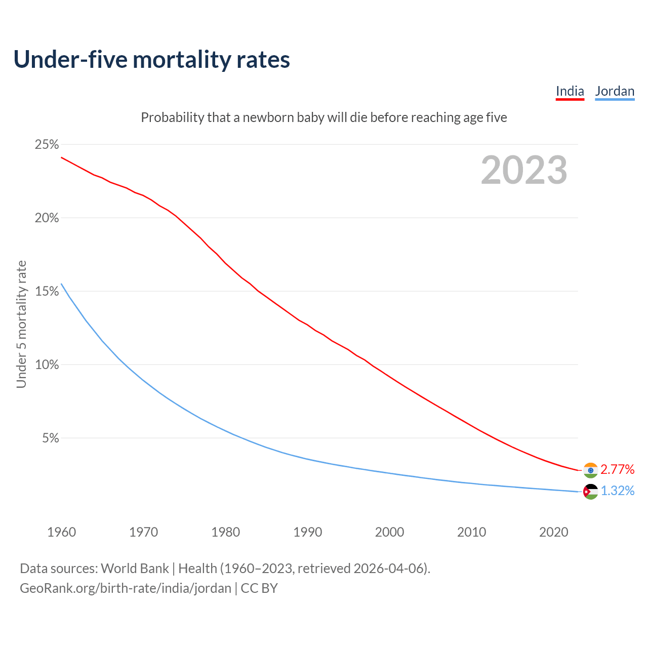 The chance that a newborn baby will die before reaching age five is 2.77% in India and 1.32% in Jordan. Above is a chart with historical data on under-five mortality rates.