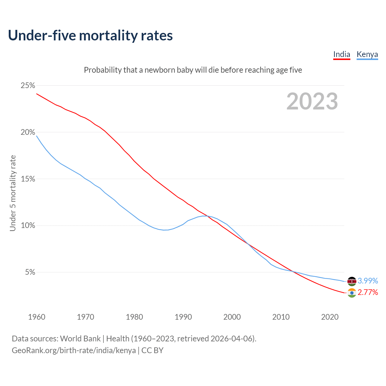 The chance that a newborn baby will die before reaching age five is 2.77% in India and 3.99% in Kenya. Above is a chart with historical data on under-five mortality rates.