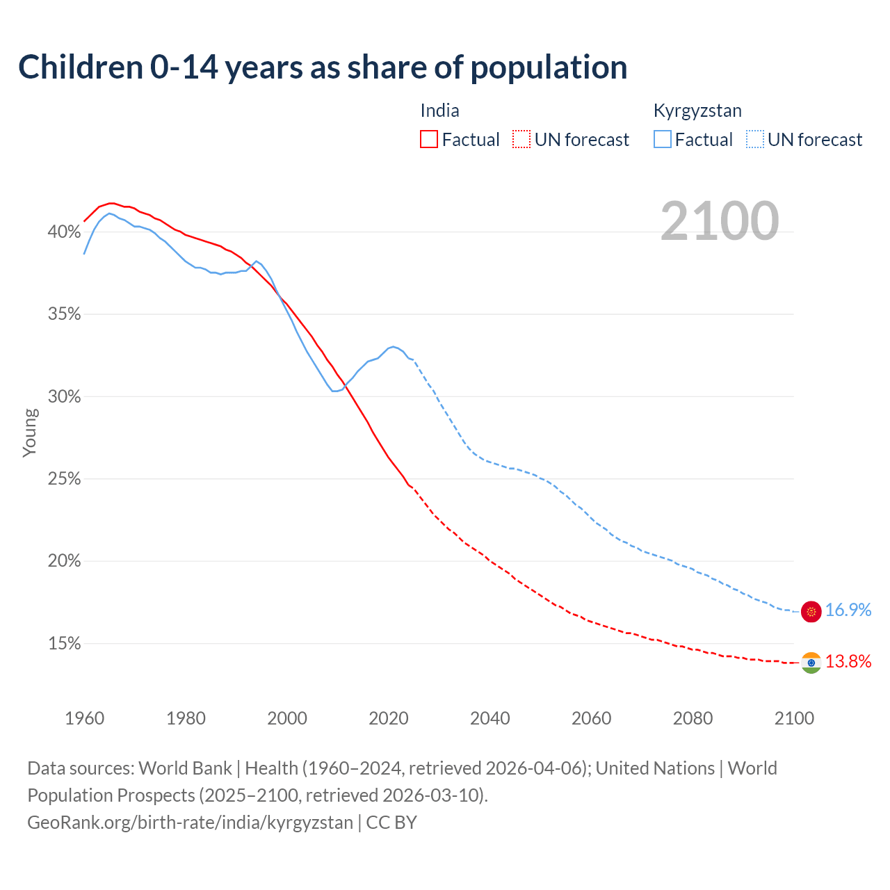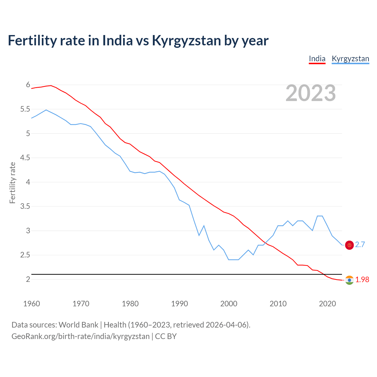 According to the latest available data on birth rates, the fertility rate in India was 1.98 children per woman in 2023, compared to 2.7 in Kyrgyzstan in 2023. The replacement level is considered to be 2.1 children per woman.