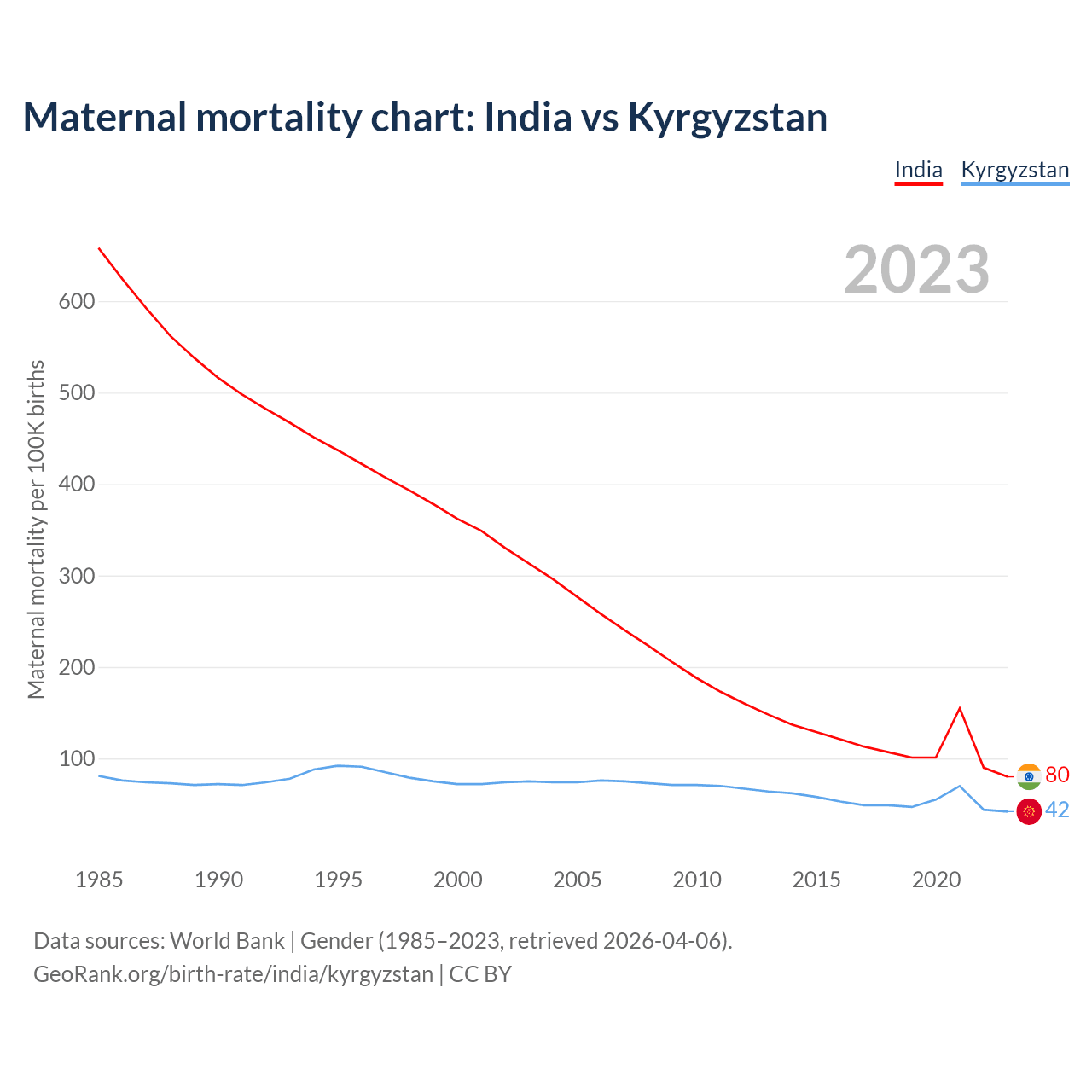 The maternal mortality rate, which is the probability of dying during childbirth or within 42 days of pregnancy termination, is 80 deaths per 100,000 live births in India, compared to 42 deaths in Kyrgyzstan.