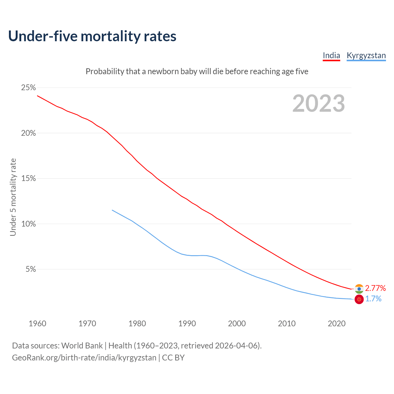 The chance that a newborn baby will die before reaching age five is 2.77% in India and 1.7% in Kyrgyzstan. Above is a chart with historical data on under-five mortality rates.