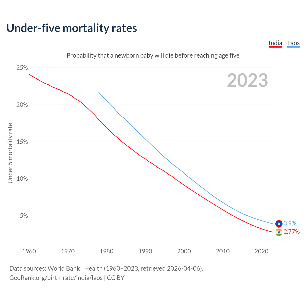 The chance that a newborn baby will die before reaching age five is 2.77% in India and 3.9% in Laos. Above is a chart with historical data on under-five mortality rates.