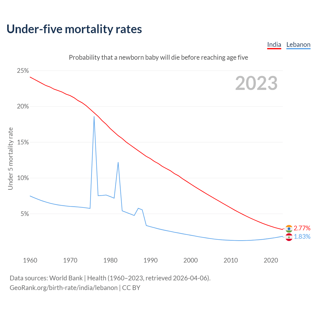 The chance that a newborn baby will die before reaching age five is 2.77% in India and 1.83% in Lebanon. Above is a chart with historical data on under-five mortality rates.