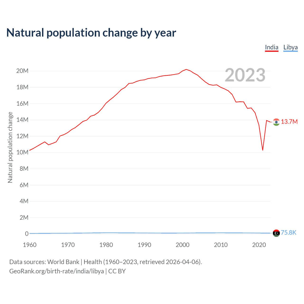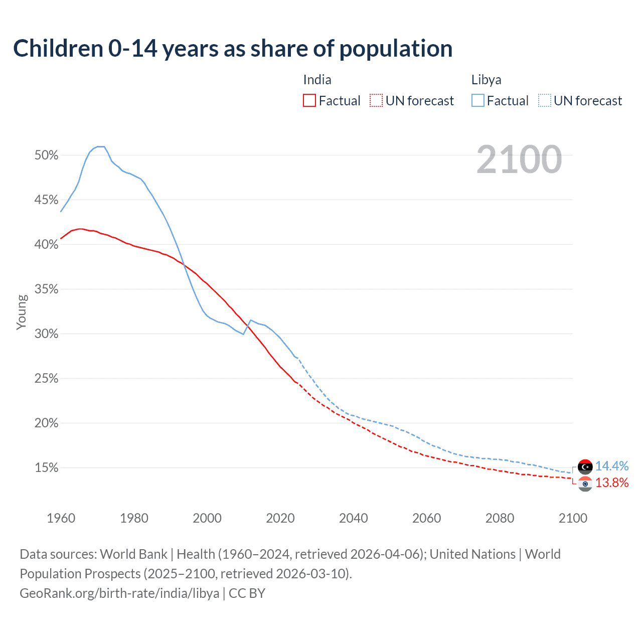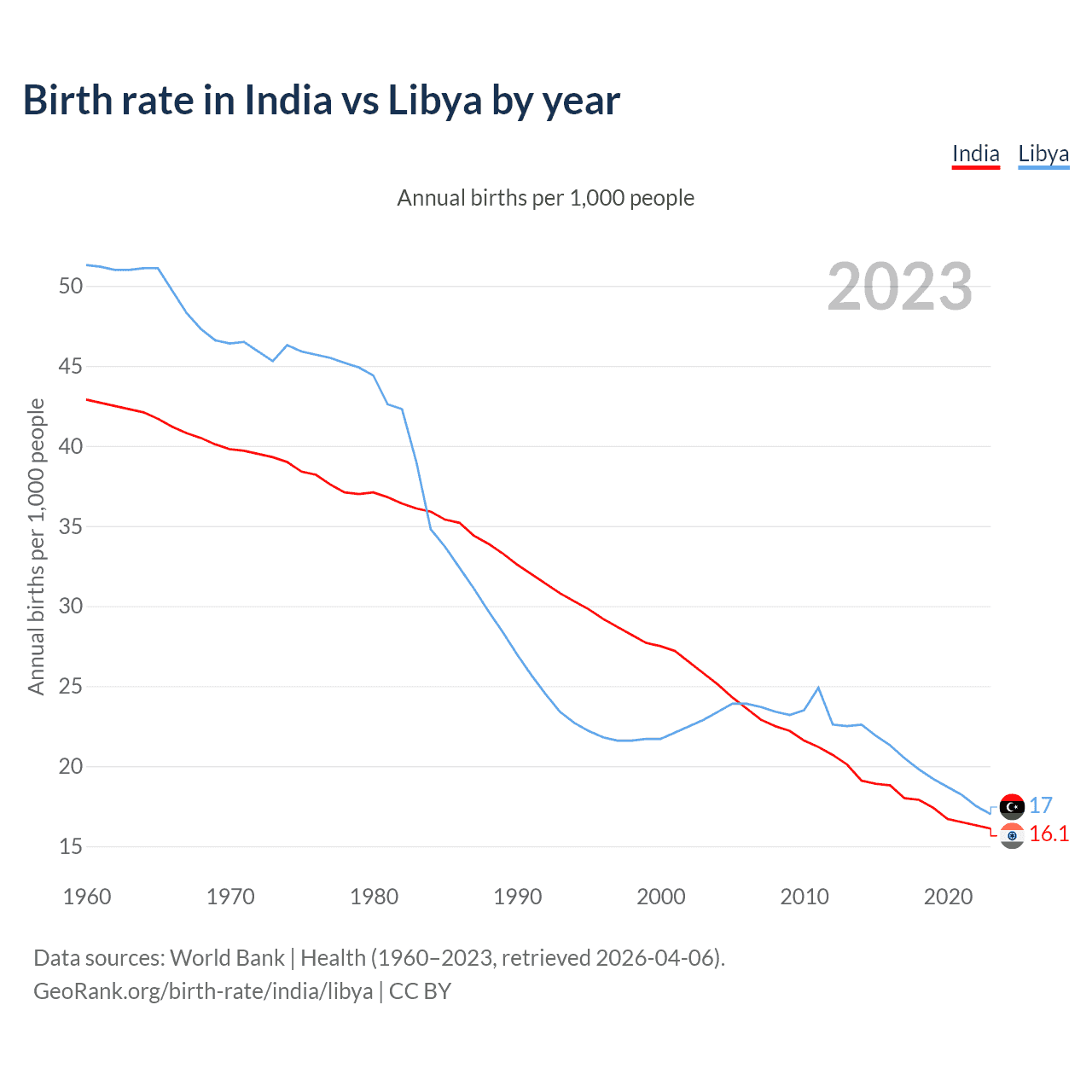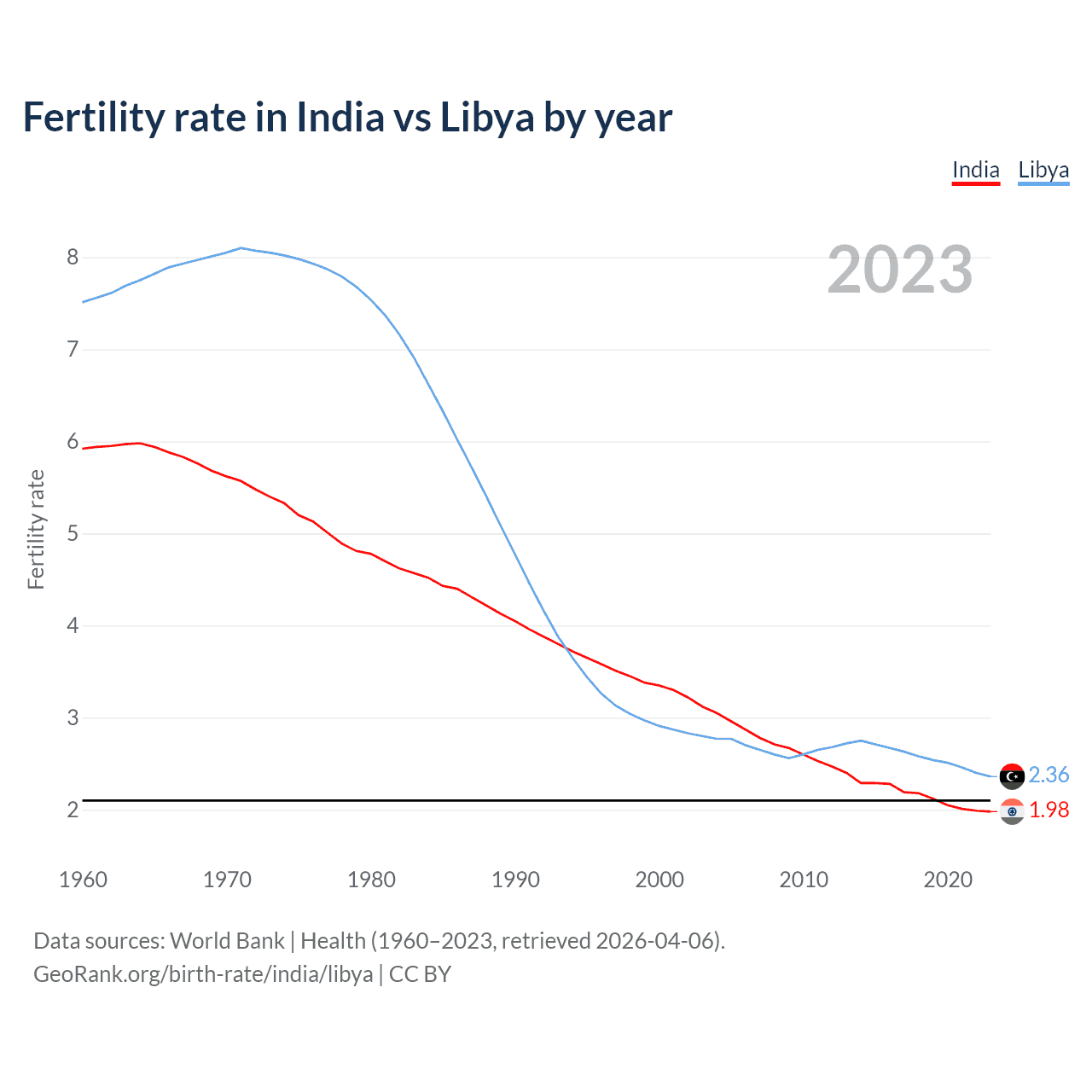 According to the latest available data on birth rates, the fertility rate in India was 1.98 children per woman in 2023, compared to 2.36 in Libya in 2023. The replacement level is considered to be 2.1 children per woman.