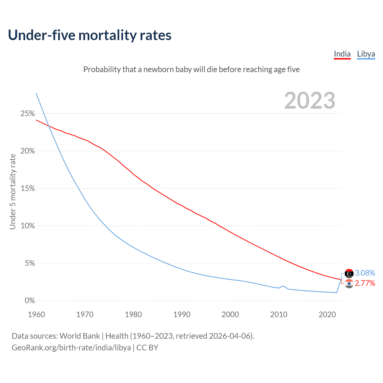 The chance that a newborn baby will die before reaching age five is 2.77% in India and 3.08% in Libya. Above is a chart with historical data on under-five mortality rates.