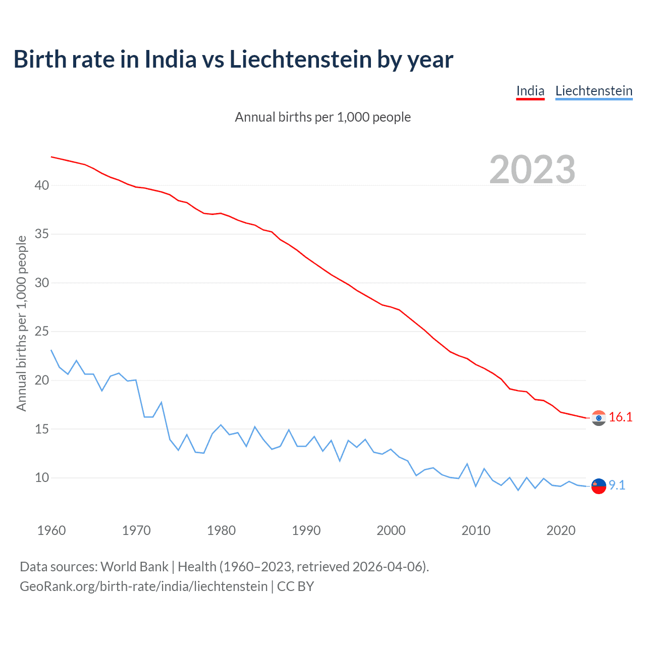 India has an annual birth rate of 16.1 births per 1,000 people, compared to 9.1 for Liechtenstein. The average number of children a woman is expected to have during her lifetime — the fertility rate, is 1.98 in India and 1.45 in Liechtenstein — 26.6% difference.