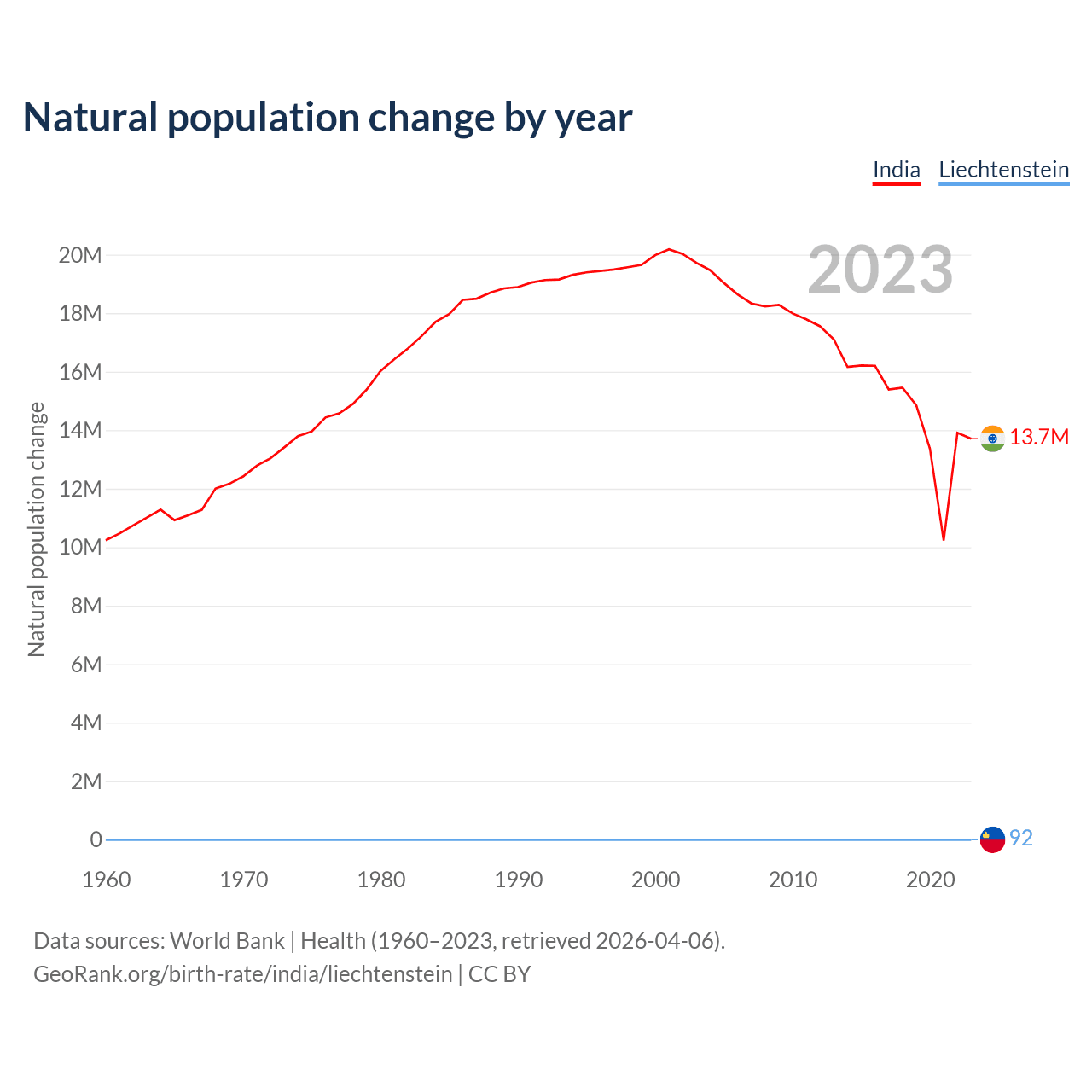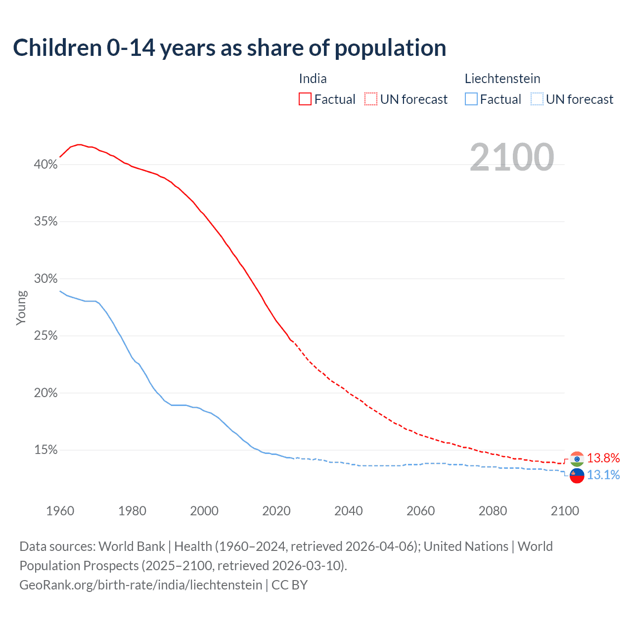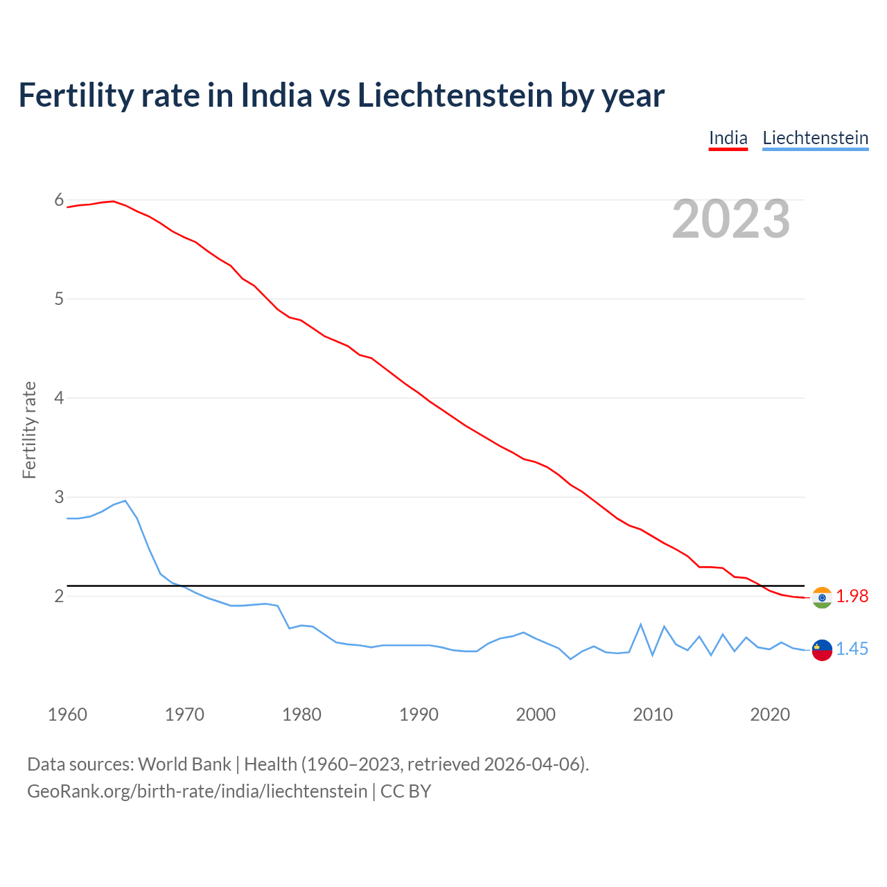 According to the latest available data on birth rates, the fertility rate in India was 1.98 children per woman in 2023, compared to 1.45 in Liechtenstein in 2023. The replacement level is considered to be 2.1 children per woman.