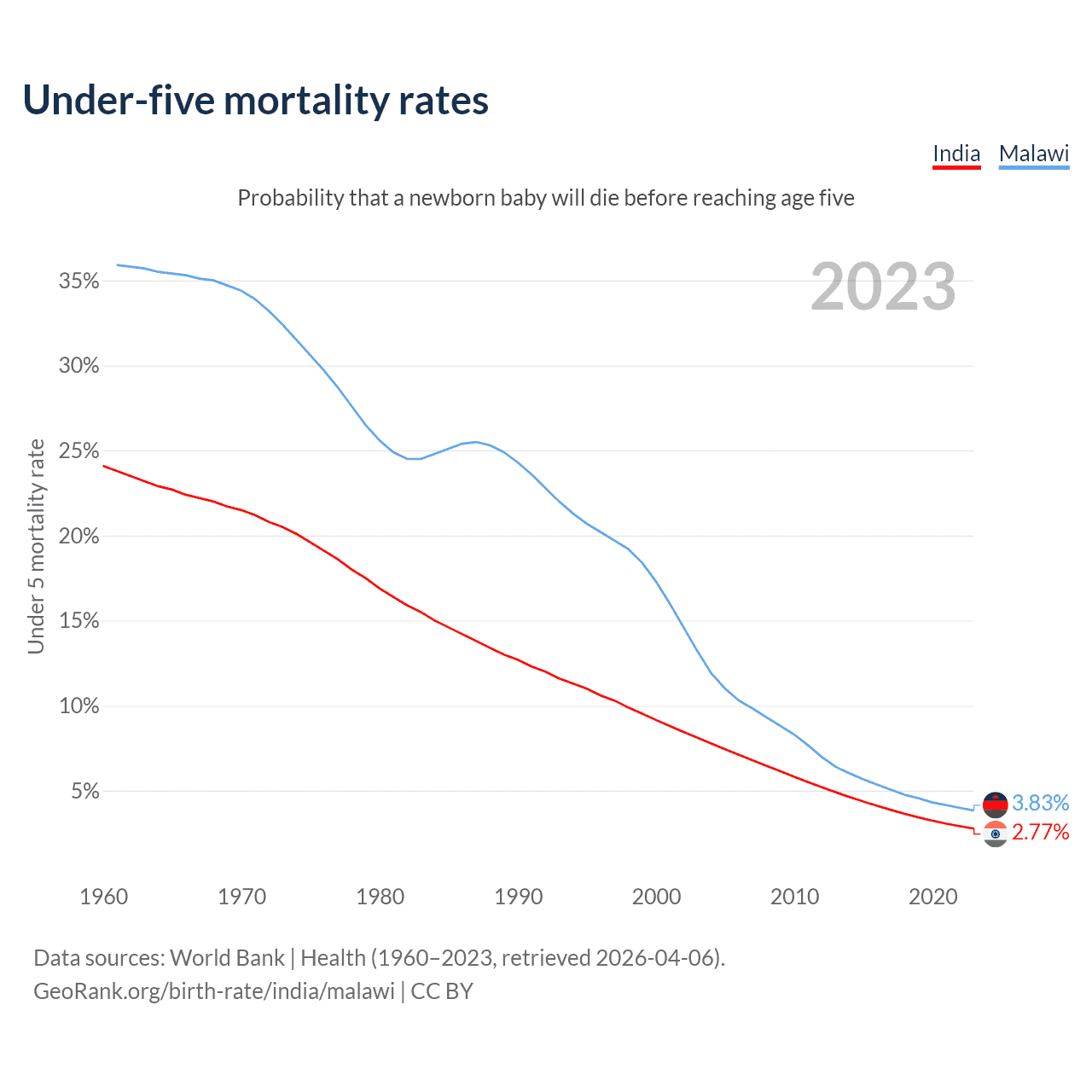 The chance that a newborn baby will die before reaching age five is 2.77% in India and 3.83% in Malawi. Above is a chart with historical data on under-five mortality rates.