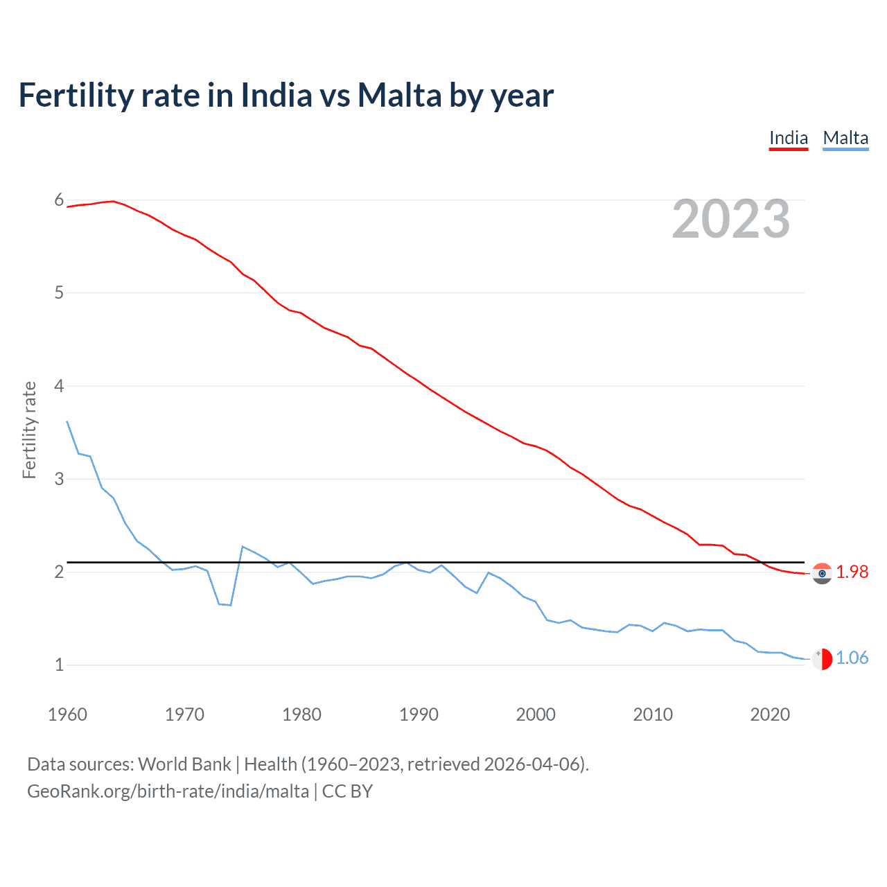 1960 vs 2023, the fertility rate has decreased by 66.6% in India and by 70.7% in Malta — in 1960, it was 5.92 and 3.62, respectively.