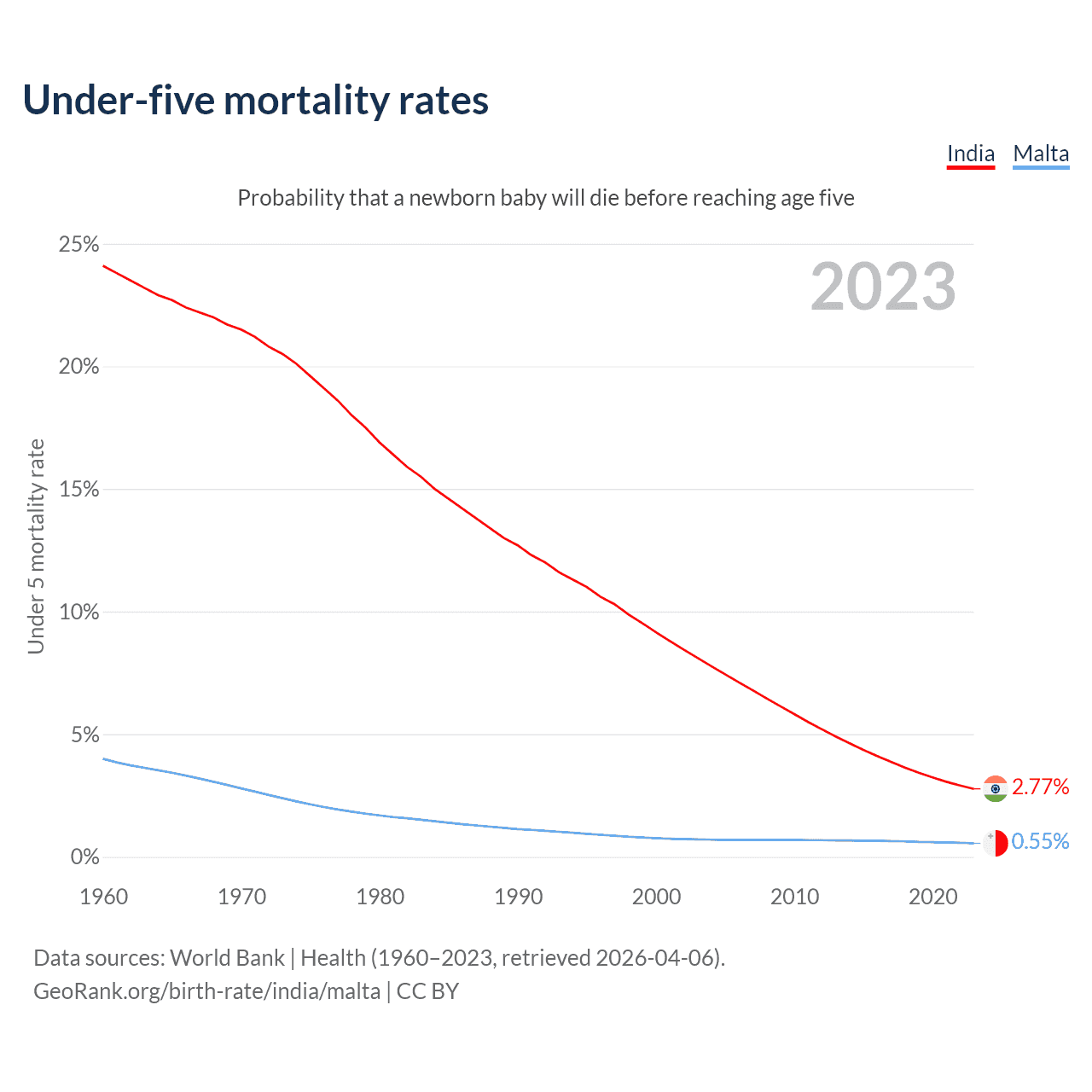 The chance that a newborn baby will die before reaching age five is 2.77% in India and 0.55% in Malta. Above is a chart with historical data on under-five mortality rates.
