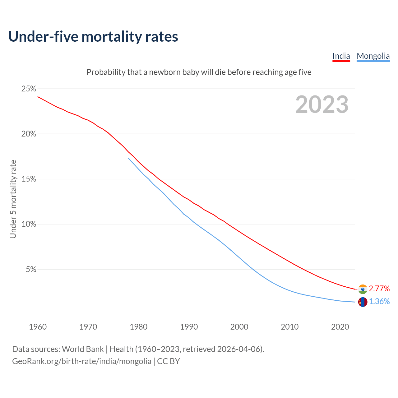 The chance that a newborn baby will die before reaching age five is 2.77% in India and 1.36% in Mongolia. Above is a chart with historical data on under-five mortality rates.