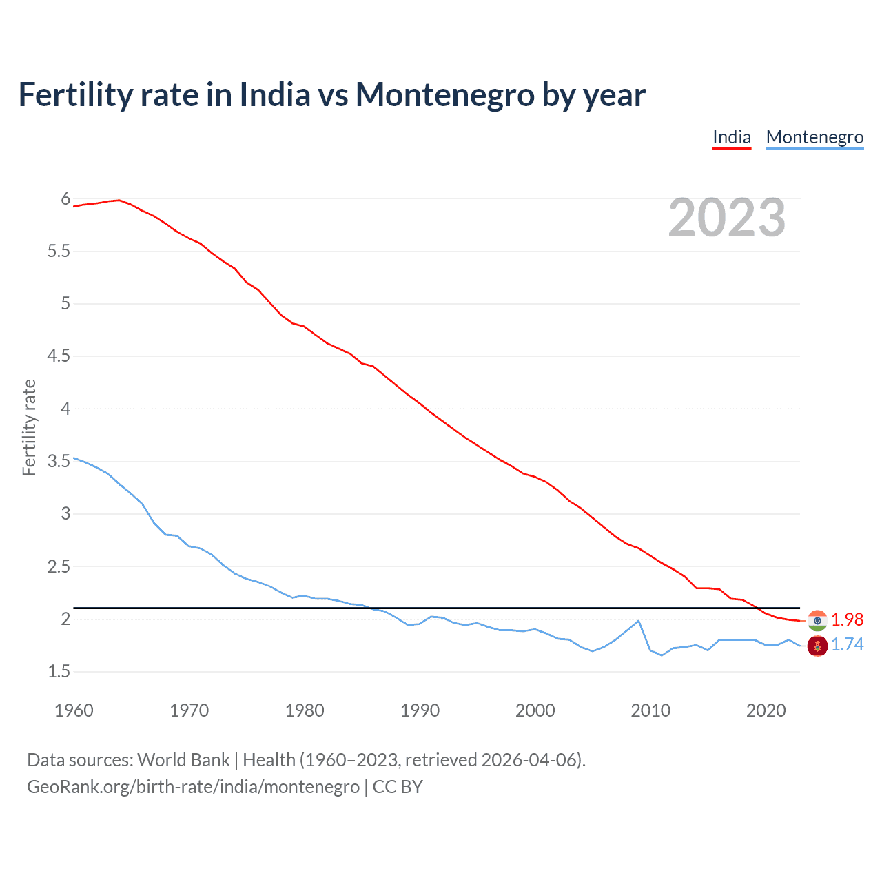 According to the latest available data on birth rates, the fertility rate in India was 1.98 children per woman in 2023, compared to 1.74 in Montenegro in 2023. The replacement level is considered to be 2.1 children per woman.