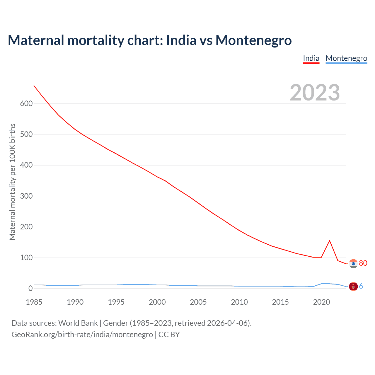 The maternal mortality rate, which is the probability of dying during childbirth or within 42 days of pregnancy termination, is 80 deaths per 100,000 live births in India, compared to 6 deaths in Montenegro.