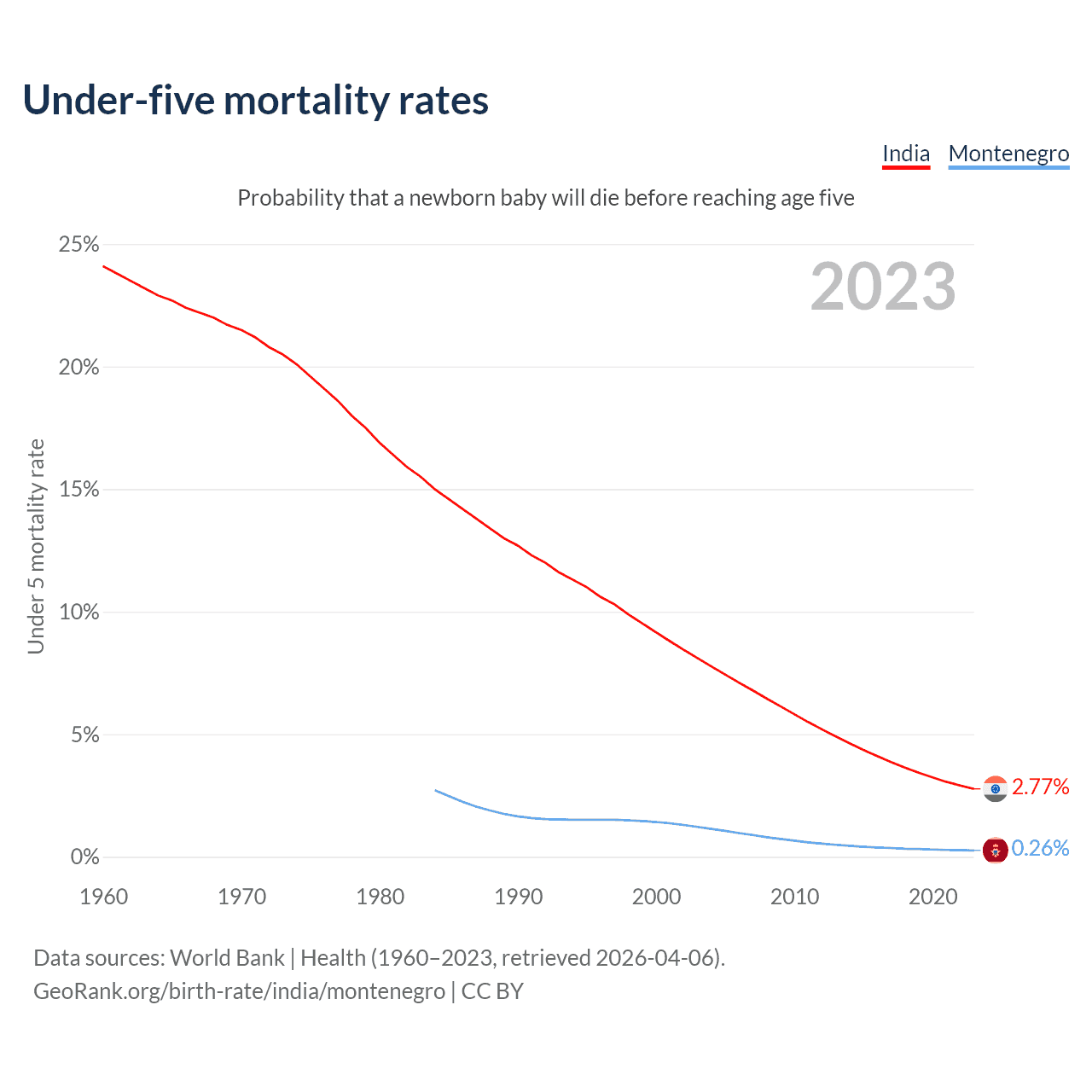 The chance that a newborn baby will die before reaching age five is 2.77% in India and 0.26% in Montenegro. Above is a chart with historical data on under-five mortality rates.