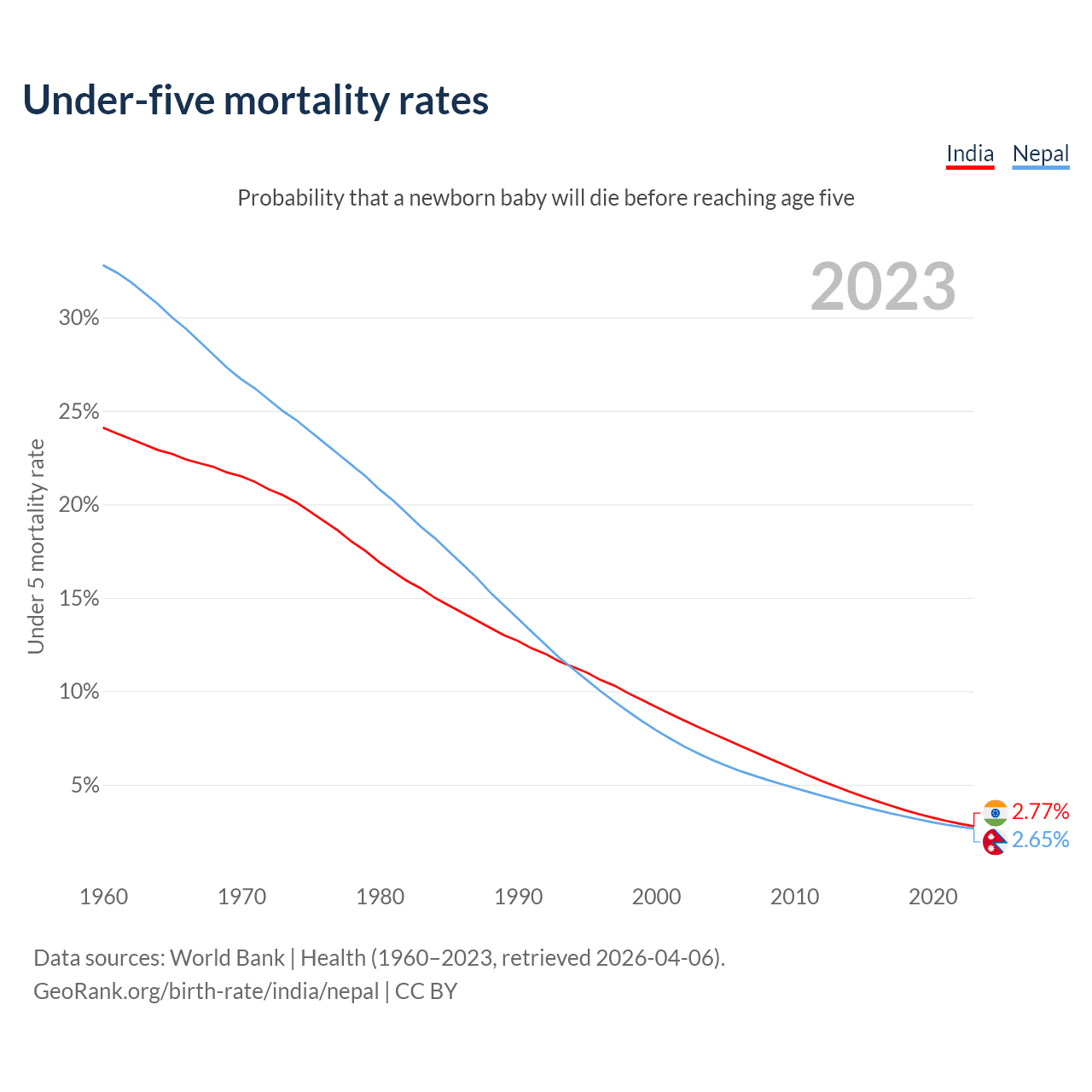 The chance that a newborn baby will die before reaching age five is 2.77% in India and 2.65% in Nepal. Above is a chart with historical data on under-five mortality rates.