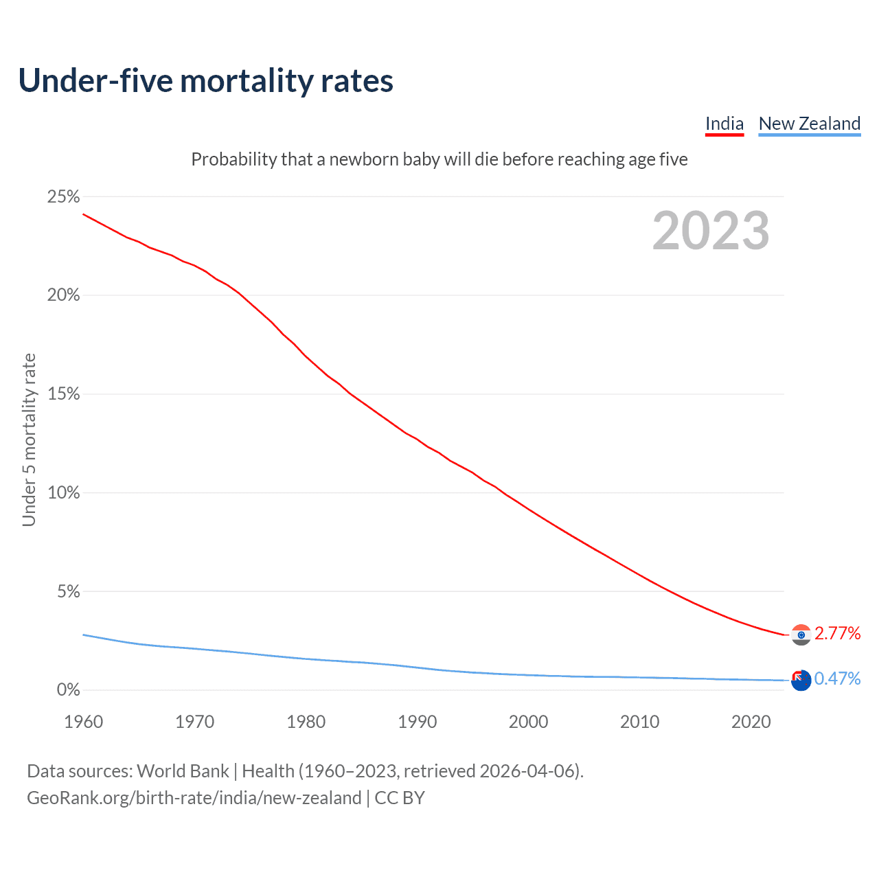 The chance that a newborn baby will die before reaching age five is 2.77% in India and 0.47% in New Zealand. Above is a chart with historical data on under-five mortality rates.