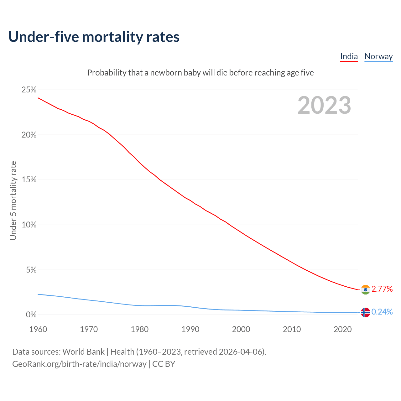 The chance that a newborn baby will die before reaching age five is 2.77% in India and 0.24% in Norway. Above is a chart with historical data on under-five mortality rates.