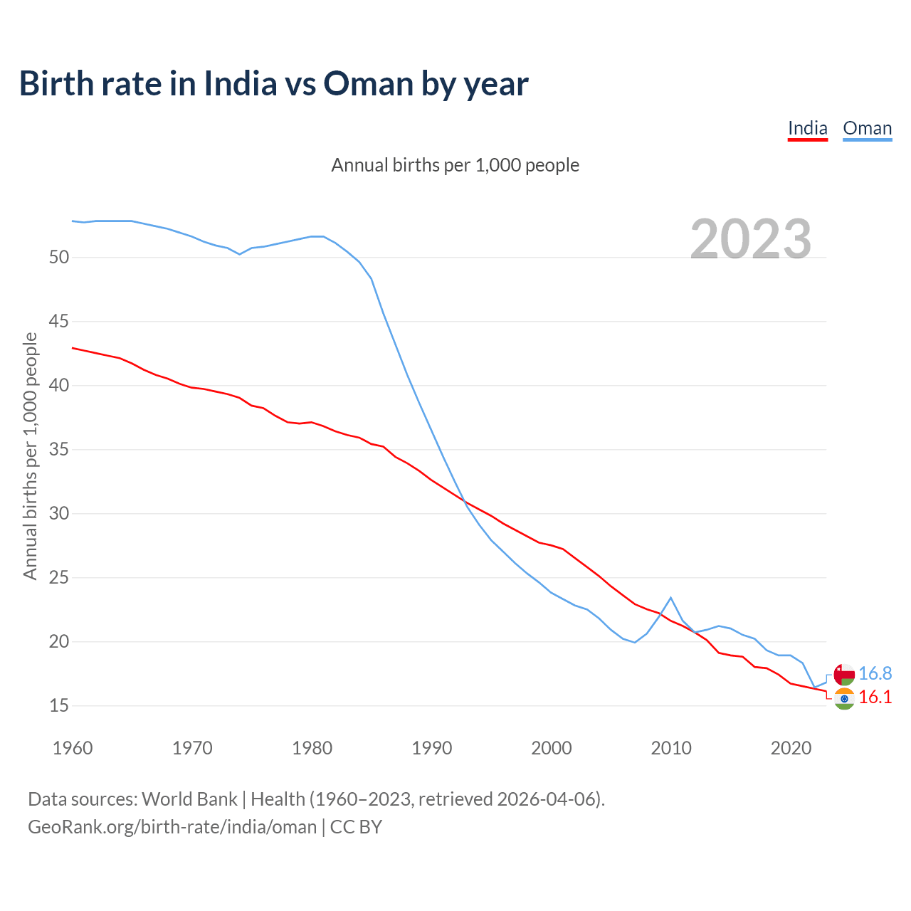 India has an annual birth rate of 16.1 births per 1,000 people, compared to 16.8 for Oman. The average number of children a woman is expected to have during her lifetime — the fertility rate, is 1.98 in India and 2.53 in Oman — 27.8% difference.