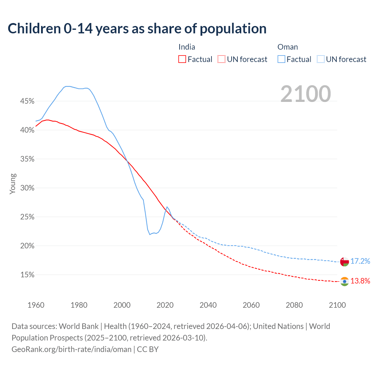 According to the latest available data on birth rates, the fertility rate in India was 1.98 children per woman in 2023, compared to 2.53 in Oman in 2023. The replacement level is considered to be 2.1 children per woman.