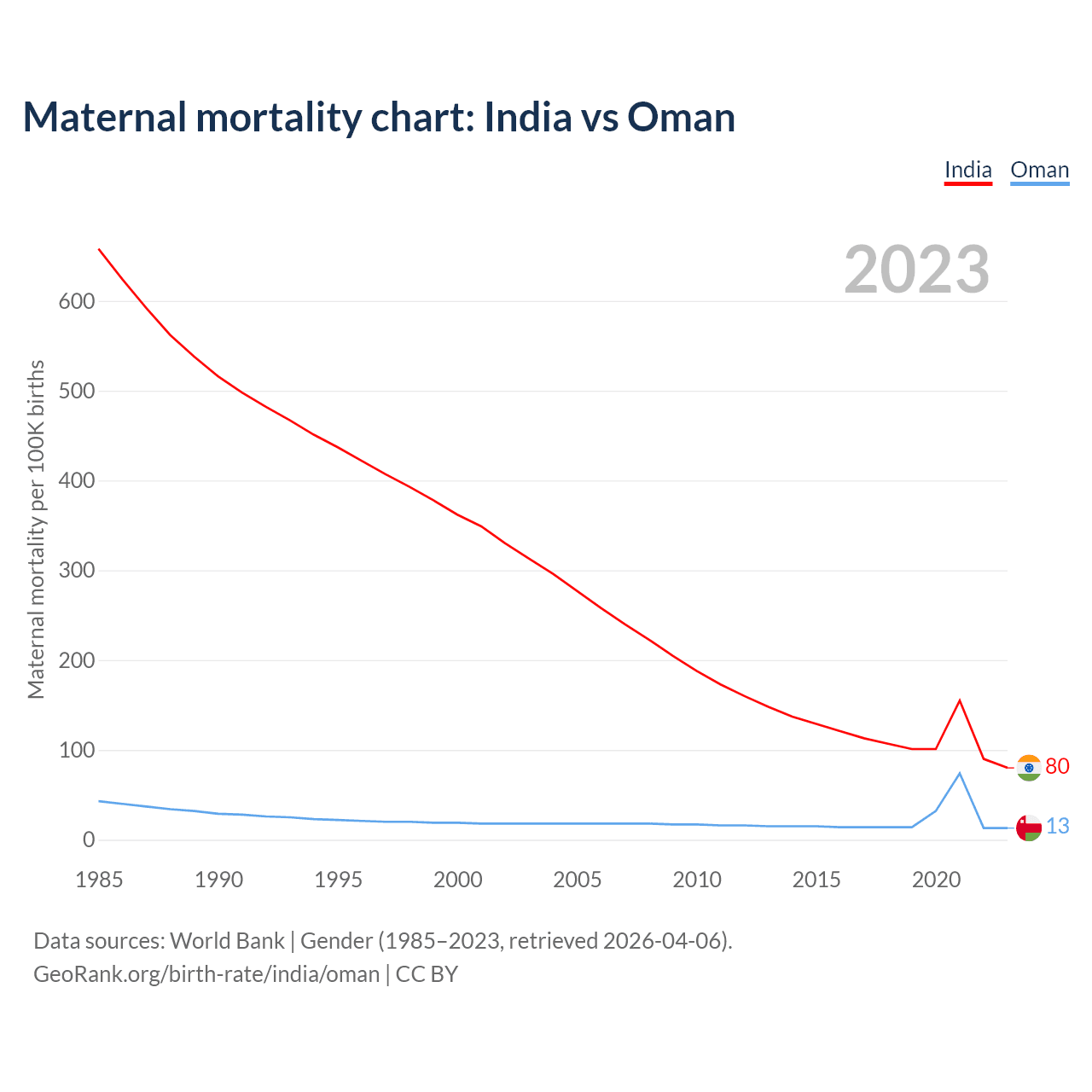 The maternal mortality rate, which is the probability of dying during childbirth or within 42 days of pregnancy termination, is 80 deaths per 100,000 live births in India, compared to 13 deaths in Oman.