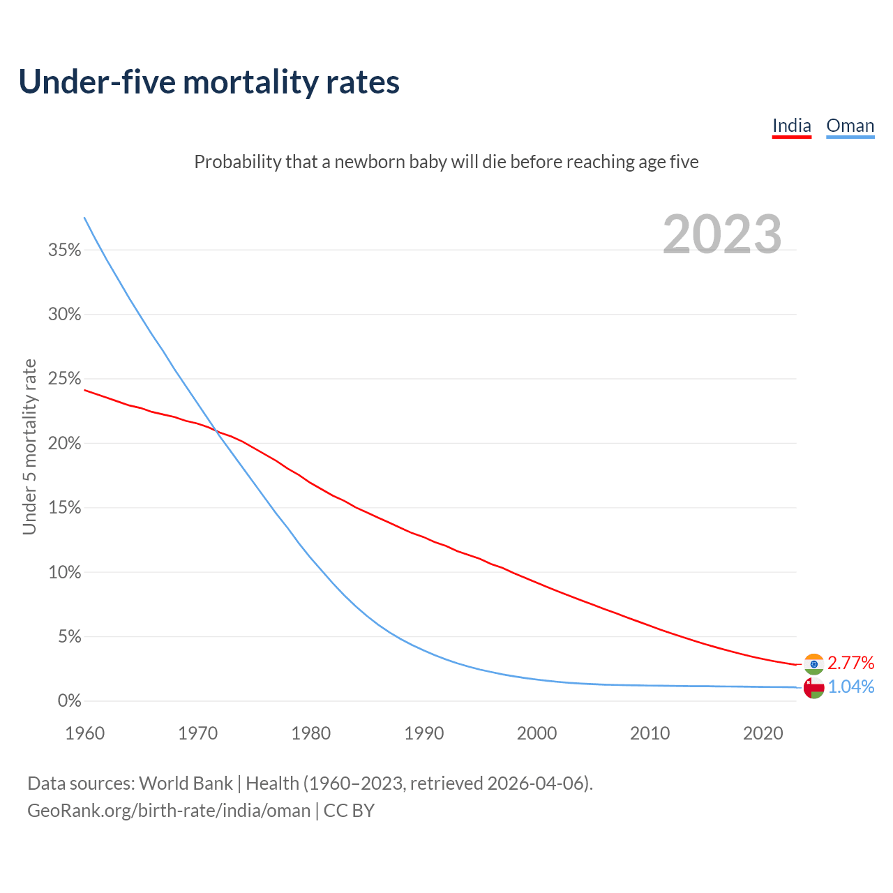 The chance that a newborn baby will die before reaching age five is 2.77% in India and 1.04% in Oman. Above is a chart with historical data on under-five mortality rates.
