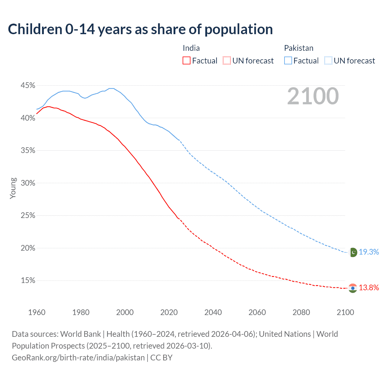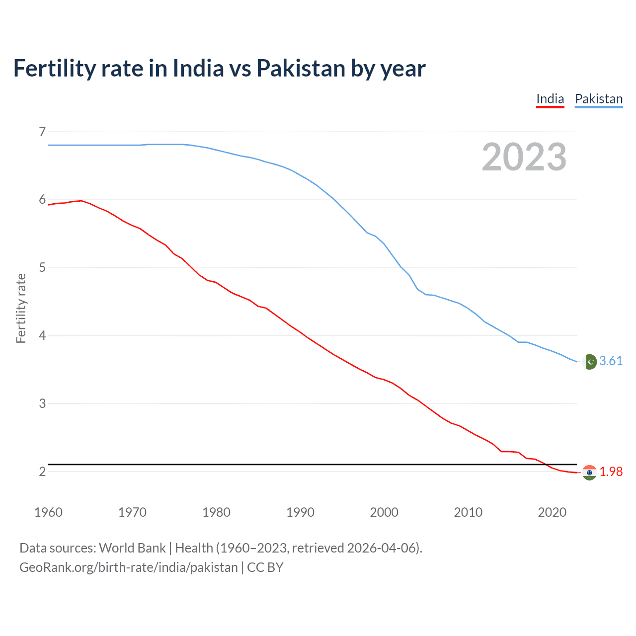 According to the latest available data on birth rates, the fertility rate in India was 1.98 children per woman in 2023, compared to 3.61 in Pakistan in 2023. The replacement level is considered to be 2.1 children per woman.