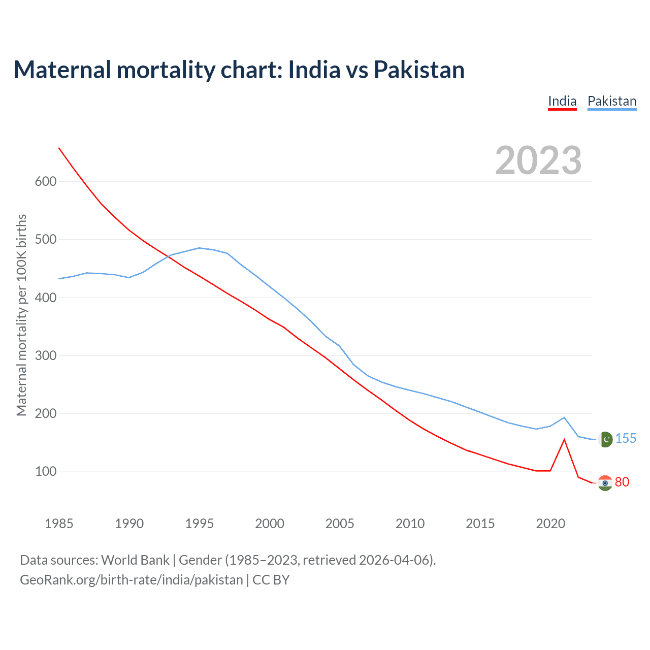 The maternal mortality rate, which is the probability of dying during childbirth or within 42 days of pregnancy termination, is 80 deaths per 100,000 live births in India, compared to 155 deaths in Pakistan.