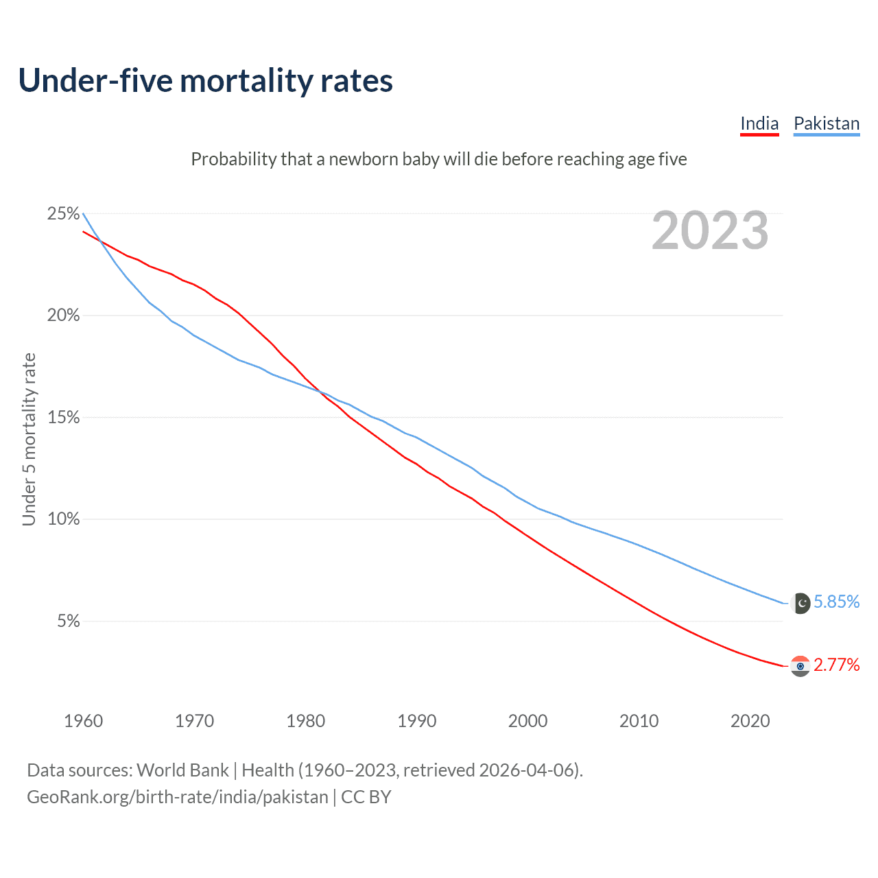 The chance that a newborn baby will die before reaching age five is 2.77% in India and 5.85% in Pakistan. Above is a chart with historical data on under-five mortality rates.
