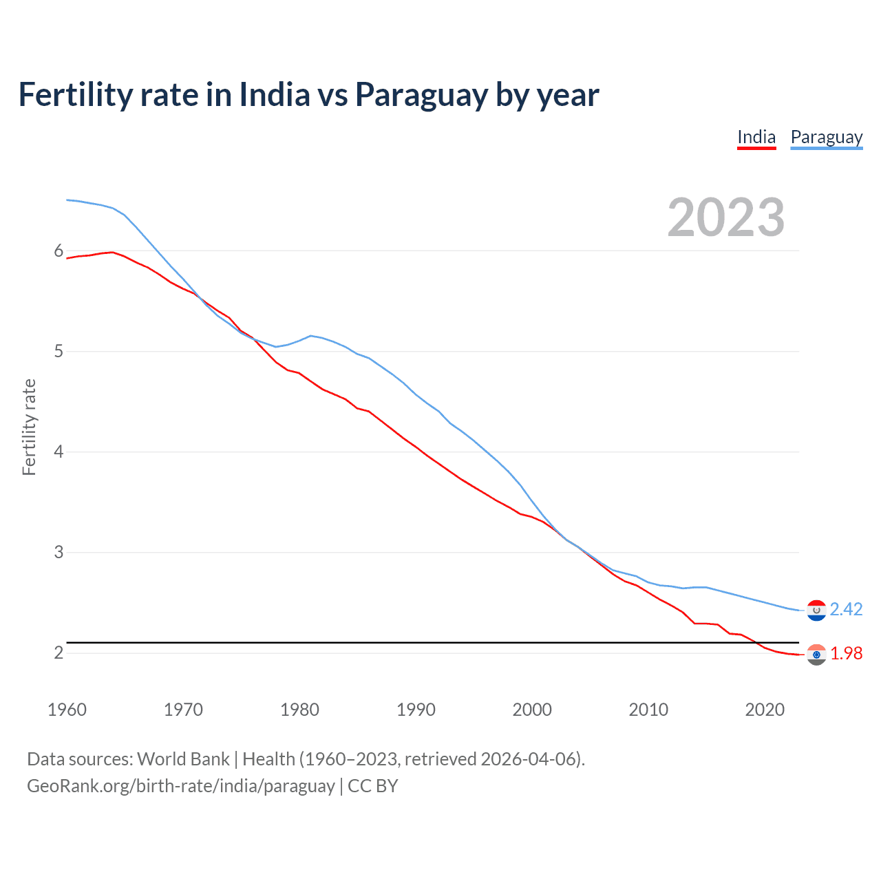 1960 vs 2023, the fertility rate has decreased by 66.6% in India and by 62.7% in Paraguay — in 1960, it was 5.92 and 6.5, respectively.