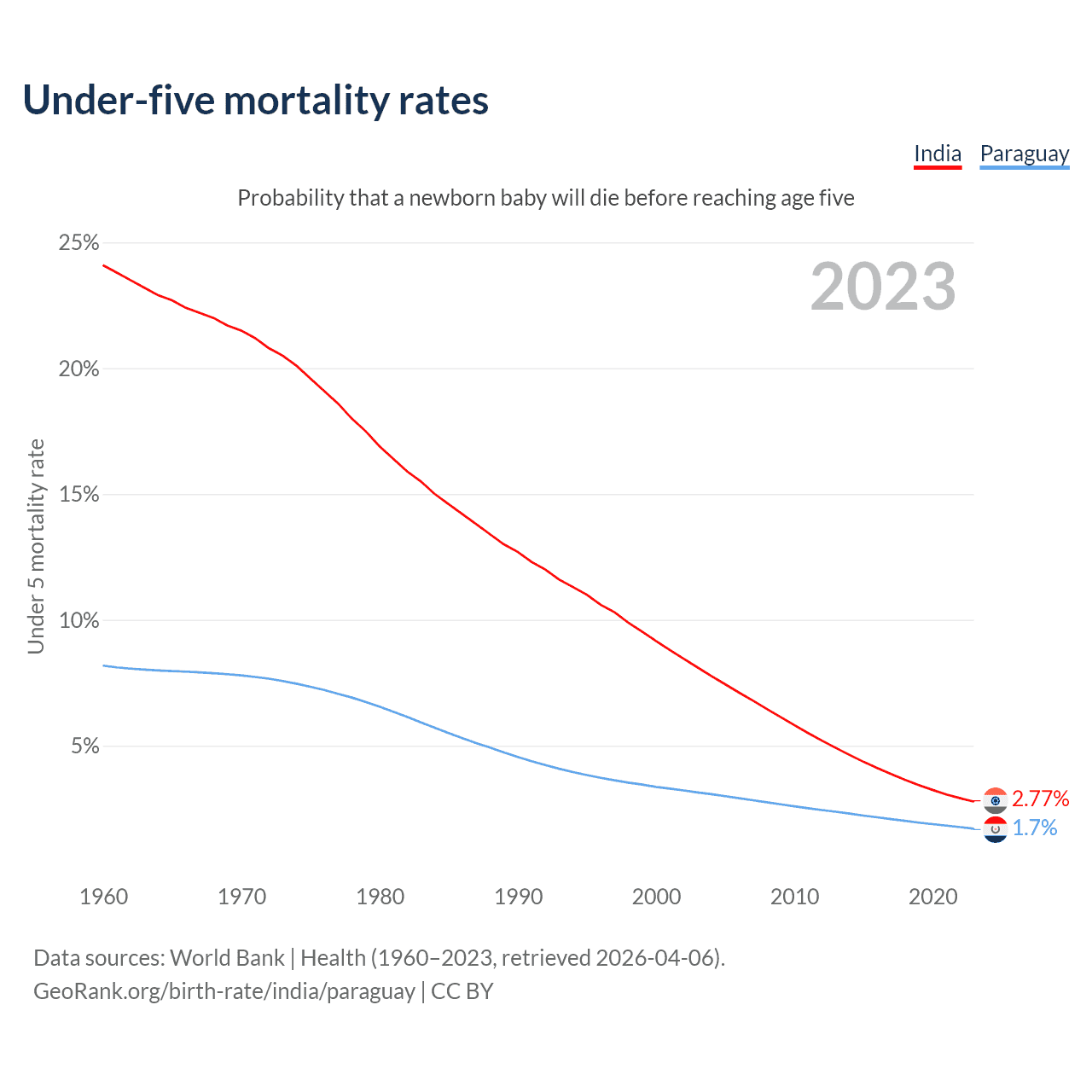 The chance that a newborn baby will die before reaching age five is 2.77% in India and 1.7% in Paraguay. Above is a chart with historical data on under-five mortality rates.