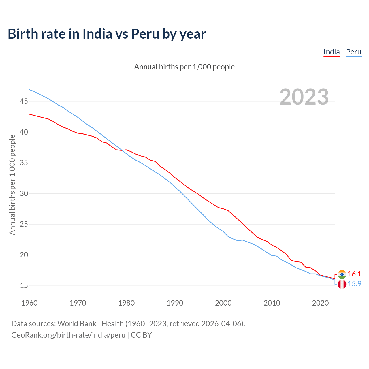 India has an annual birth rate of 16.1 births per 1,000 people, compared to 15.9 for Peru. The average number of children a woman is expected to have during her lifetime — the fertility rate, is 1.98 in India and 1.98 in Peru — 0.25% difference.