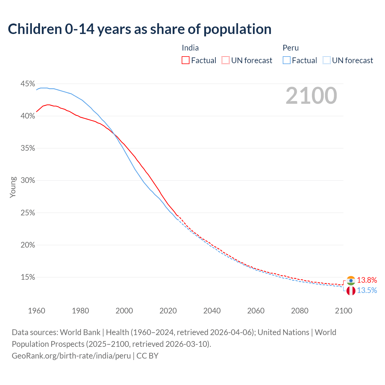 According to the latest available data on birth rates, the fertility rate in India was 1.98 children per woman in 2023, compared to 1.98 in Peru in 2023. The replacement level is considered to be 2.1 children per woman.