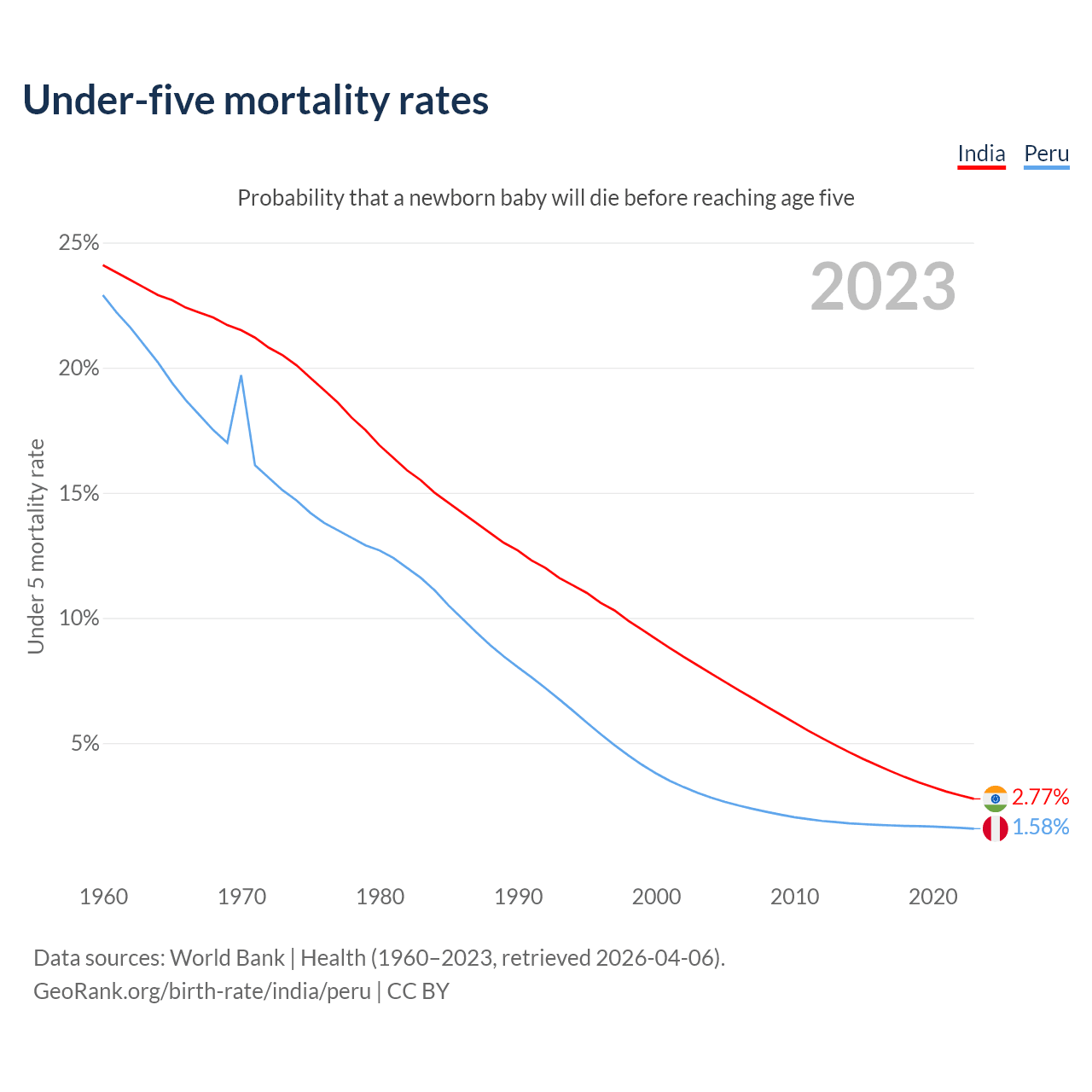 The chance that a newborn baby will die before reaching age five is 2.77% in India and 1.58% in Peru. Above is a chart with historical data on under-five mortality rates.