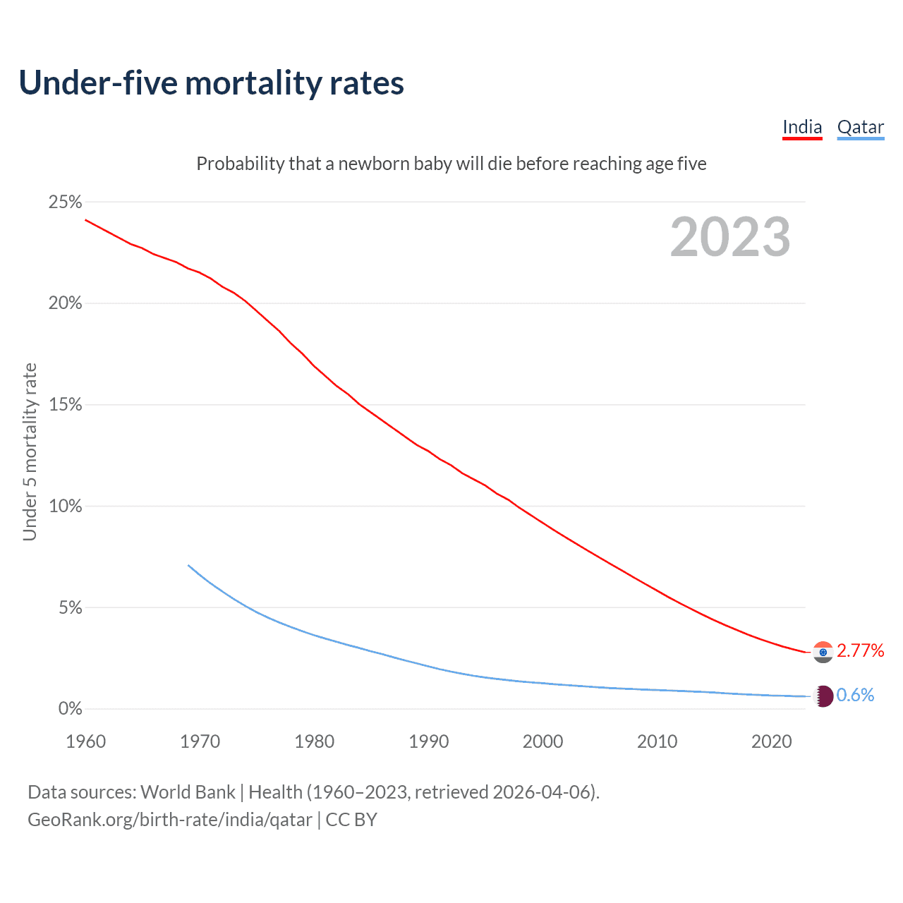The chance that a newborn baby will die before reaching age five is 2.77% in India and 0.6% in Qatar. Above is a chart with historical data on under-five mortality rates.