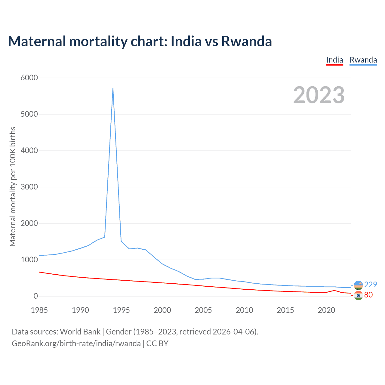 The maternal mortality rate, which is the probability of dying during childbirth or within 42 days of pregnancy termination, is 80 deaths per 100,000 live births in India, compared to 229 deaths in Rwanda.