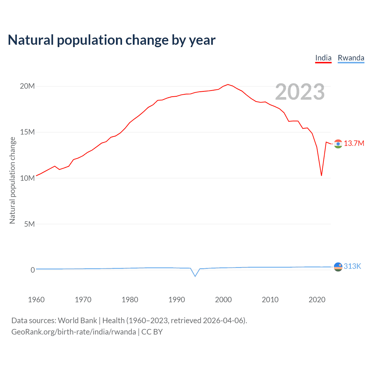 India has an annual birth rate of 16.1 births per 1,000 people, compared to 28.3 for Rwanda. The average number of children a woman is expected to have during her lifetime — the fertility rate, is 1.98 in India and 3.7 in Rwanda — 87.2% difference.