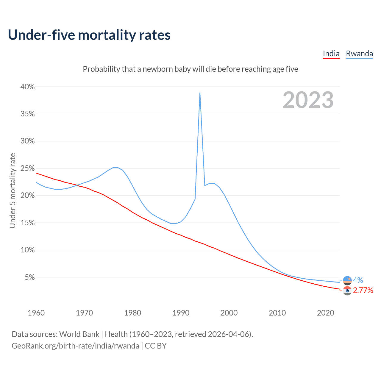 The chance that a newborn baby will die before reaching age five is 2.77% in India and 4% in Rwanda. Above is a chart with historical data on under-five mortality rates.